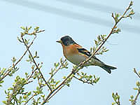 ![]() 確かに喉がオレンジ色に変わってきたオジロビタキ♂(南千里) 桜の蕾の中でひときわ愛らしい。 |