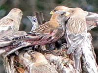 ずーっと居付いてくれたハギマシコ。おそらくこれが最後の名残りになるだろうと、またスタコラ山登り。多分来年以降、もうこんなチャンスには恵まれないと思うと、なんとも切ない・・・。群れから1羽の脱落者も出さないで、無事に北へ帰ってほしい。さよなら~、ありがとう~! | |