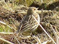 ![]() タヒバリの群れにたった1羽。判別が難しいが多分これがそのマキバタヒバリだろう。 |