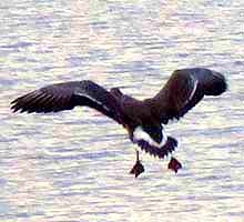![]() カリガネ 少し若いようで、嘴から額にかけて白く禿げ上がる部分が小さく、まだらな感じ。 |