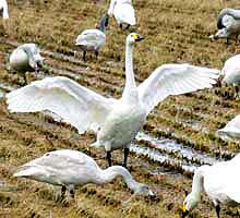 ![]() あぁ、飛んだ!しばらく旋回して隣の畑に着地 オオハクチョウ? 特に右側の子・・ |