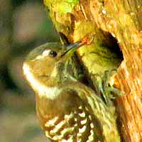 たしか、一昨年もこの樫の木公園でアカゲラ♀を撮った記憶がある。昨年は話を聞かなかったが、どうやら今冬はまた居るらしい。以前は3時過ぎに出ていたので、先日同じ時間帯に行ってみたら、カメラマンは居ないし、まったくそれらしき気配がなかった。ガセネタかな?と思って聞き直したら、時間が4時半から5時くらいだとか・・。仕方なく日を変えて、時間も4時半を回った頃に、公園に着いた。さすが、先客が2人、以前と同じ場所に待機中。5分もしない内に巣穴の周辺にアカゲラが現れた。すごい正確さ・・。面白いことに、一度巣穴に入り、終ったかと諦めかけたら、また出てきて周辺をウロウロし出した。結局30分ばかり撮らせてくれて、2度目に巣穴に入っておしまい。アカゲラは12月に枚方で♂♀を撮ったので、今冬は2度目のゲットになる。今度はアオゲラが撮りたいなぁ。 | |