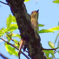 今日も特に当てなく、大阪城をのぞいてみた。飛騨の森から入ったがほとんどスルー状態。市民の広場にはまだキクイタダキが居るようだ。相変わらず高い所で見え隠れして碌に撮れない。偶然、アオバト♀が止まているのを誰かが見つけたので、撮らせてもらった。クロツグミはもう誰も探そうとはしない。仕方なく早々に引き上げた。 | |