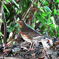 クロツグミがずいぶん長く居るようだ。木止まりだったり、水場だったり・・。今回は胸の斑点が少し赤みがかって、どうやら♀タイプ。背中の羽が黒っぽいので、多分♂の若だろう。 突然、「コマドリや!」と誰かが叫んだ。たしかに、水場にそろりと出てきたのはコマドリの♀のようだ。♀の若か、かなり色が薄い。しかし姿はまぎれもなくコマドリで尻尾をピント立てる仕草がかわいい。おぉ、今季初だ。春コマドリ、秋ノゴマ、と言われるように、秋はコマドリが出にくいので♀ながらうれしい。 |