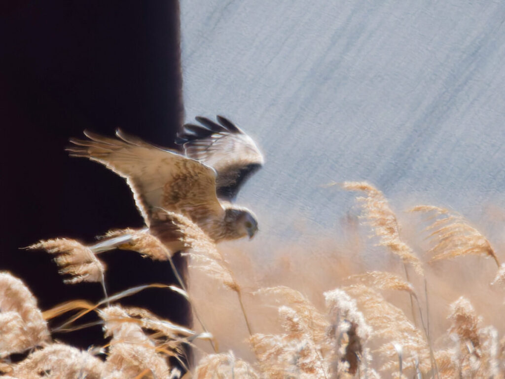 ツリスガラはピントがあわずいまいち。一息ついて遠くを眺めてるとチュウヒ登場
