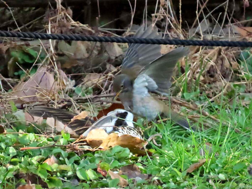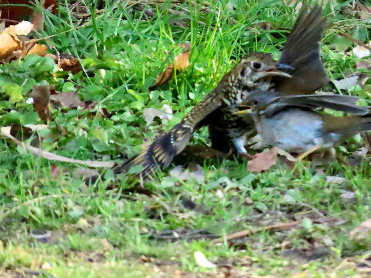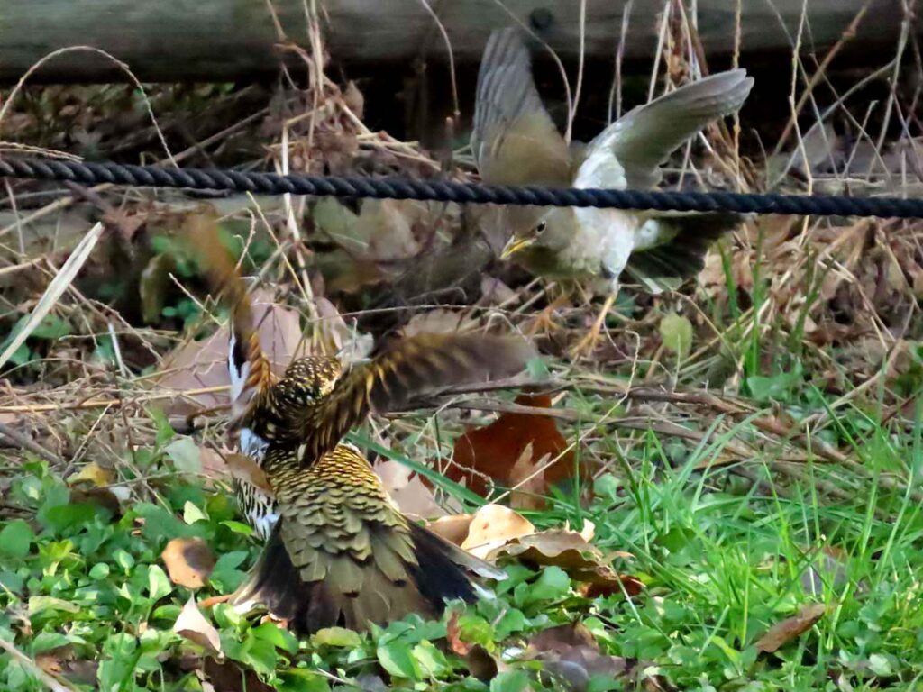 ところがいきなりシロハラがトラツグミにバトル。大きい方のトラツグミが地面にへばりついていた。