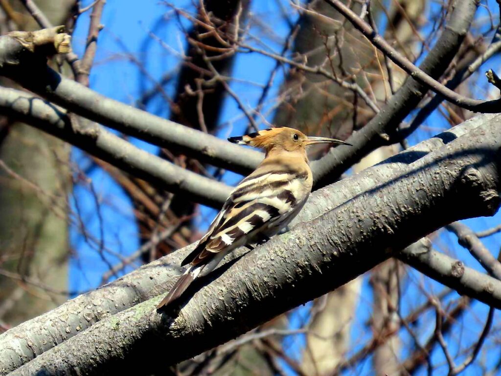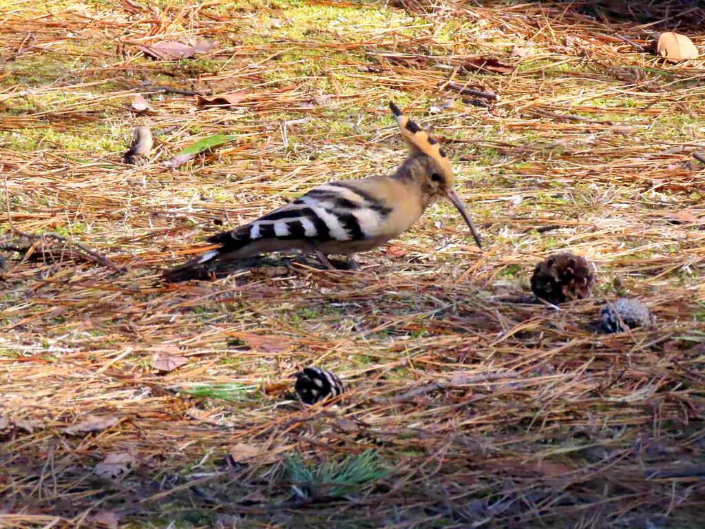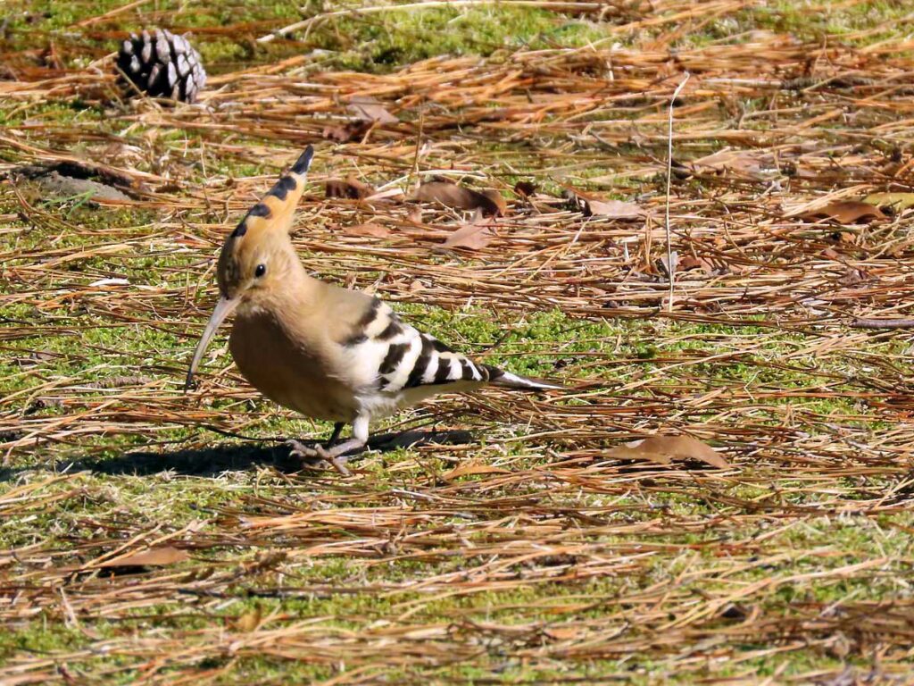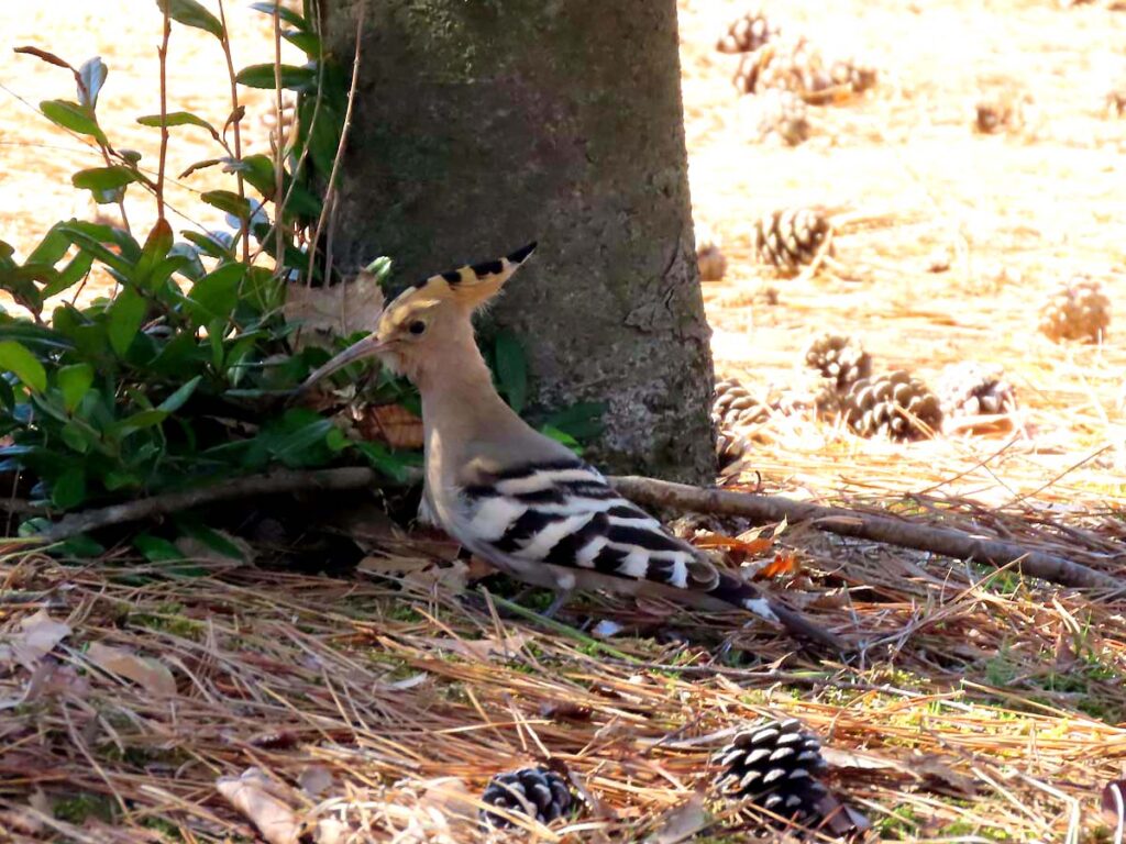 2月末から居るというヤツガシラ、まだ居るかとヒヤヒヤしながら今日を待った。ところが現地に着くとすでに多くのカメラマンが撮っている最中。なんと、ほんの4・5mの近さで皆さんぐるりと円陣を囲んでいる。本命のヤツガシラはまるで意に介さず、黙々と餌をつついている。え、こんな事って…ある?いよいよどこかへ移動する準備かな?とにかく間に合って良かった。そのうちに冠羽を広げて羽を広げ、こちらの隙を狙うように飛びたった。その時、もう1羽が交差するように出て、どこかへ隠れた。一瞬、目を疑ったが、皆さん2羽居ることはご存知のようだった。元の1羽は運よく傍の枝に止まり、しばらく撮ってい居ると今度はもっと遠くへ飛んでしまった。皆探しに行くと思いきや大方は元の場所へ戻りのんびりしている。「どうせ戻って来るよ」と言わんばかり。たっぷり撮れたので私達は広い園内をついでに他の鳥が居ないか探しながら歩き回ったが、結局めぼしい鳥は見つからなかった。海が近いので景色を撮りに出る直前に何気なく撮った1羽がツグミと思っていたら、どうやらハチジョウツグミのようだった。再び元の場所へ戻ってみると、やっぱり、先刻と同じように円陣の中にヤツガシラが黙々と餌をつついていた。念のためもう一度撮って、切りが無いので引き上げた。