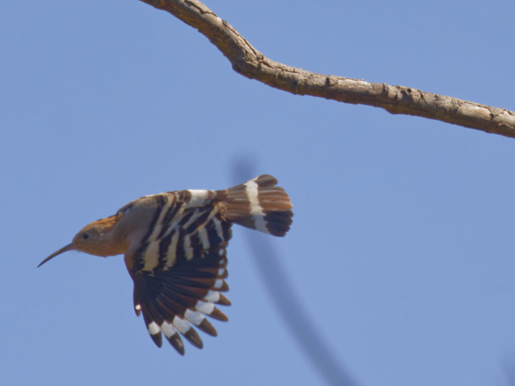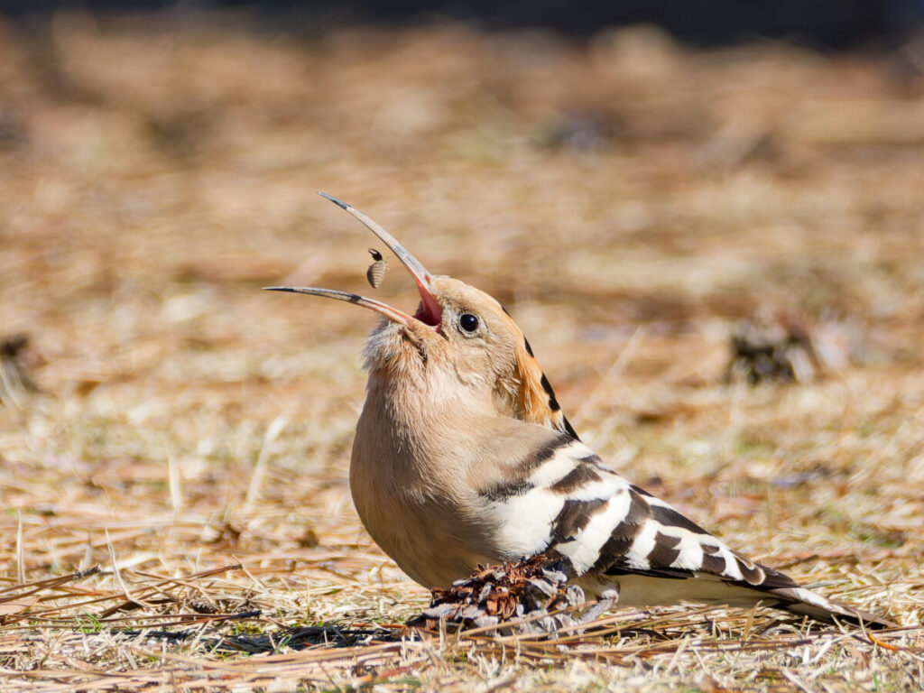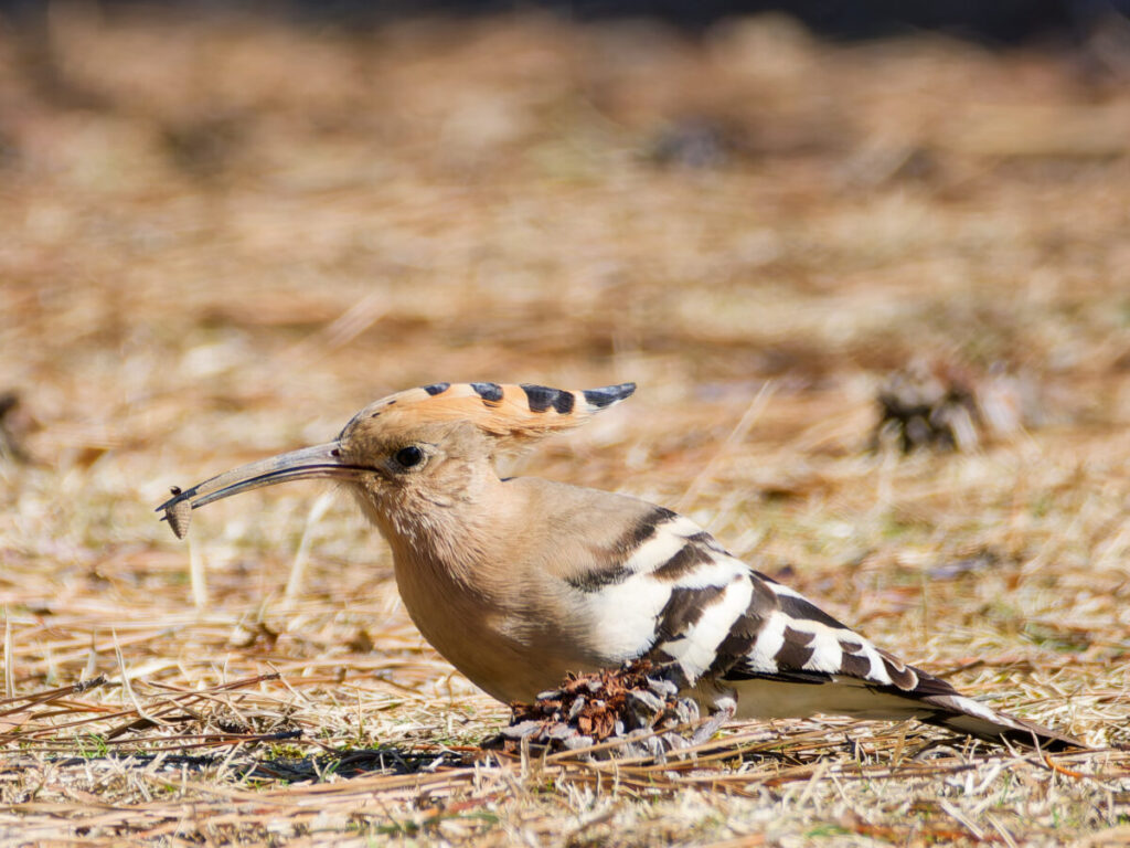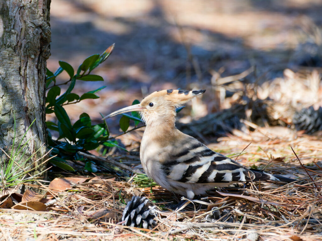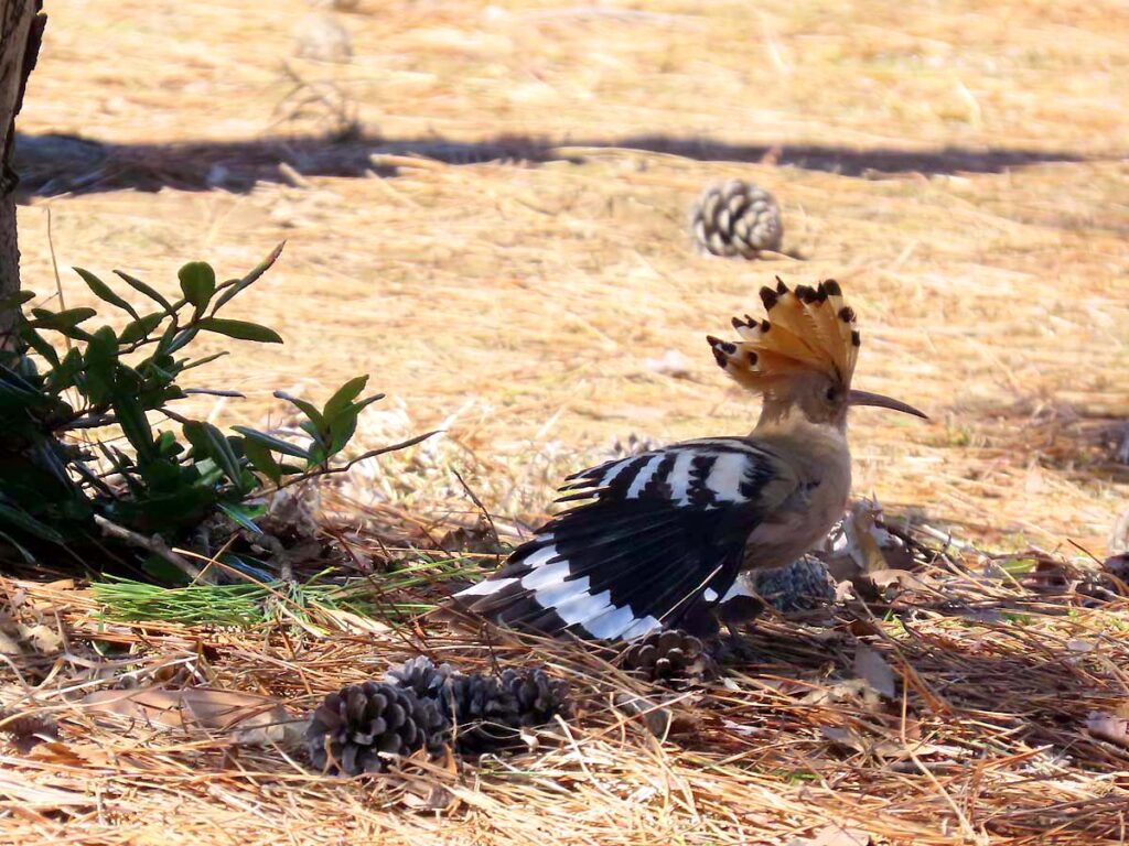 2月末から居るというヤツガシラ、まだ居るかとヒヤヒヤしながら今日を待った。ところが現地に着くとすでに多くのカメラマンが撮っている最中。なんと、ほんの4・5mの近さで皆さんぐるりと円陣を囲んでいる。本命のヤツガシラはまるで意に介さず、黙々と餌をつついている。え、こんな事って…ある?いよいよどこかへ移動する準備かな?とにかく間に合って良かった。そのうちに冠羽を広げて羽を広げ、こちらの隙を狙うように飛びたった。その時、もう1羽が交差するように出て、どこかへ隠れた。一瞬、目を疑ったが、皆さん2羽居ることはご存知のようだった。元の1羽は運よく傍の枝に止まり、しばらく撮ってい居ると今度はもっと遠くへ飛んでしまった。皆探しに行くと思いきや大方は元の場所へ戻りのんびりしている。「どうせ戻って来るよ」と言わんばかり。たっぷり撮れたので私達は広い園内をついでに他の鳥が居ないか探しながら歩き回ったが、結局めぼしい鳥は見つからなかった。海が近いので景色を撮りに出る直前に何気なく撮った1羽がツグミと思っていたら、どうやらハチジョウツグミのようだった。再び元の場所へ戻ってみると、やっぱり、先刻と同じように円陣の中にヤツガシラが黙々と餌をつついていた。念のためもう一度撮って、切りが無いので引き上げた。