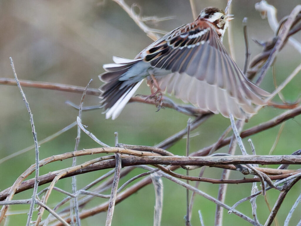 あと、名所をのぞき、河口へ寄ると、キジ♀っぽい2羽が田んぼから堤防を越えて河原へ飛んで行ったり、カシラダカが夕暮れの葭原に戯れていた。