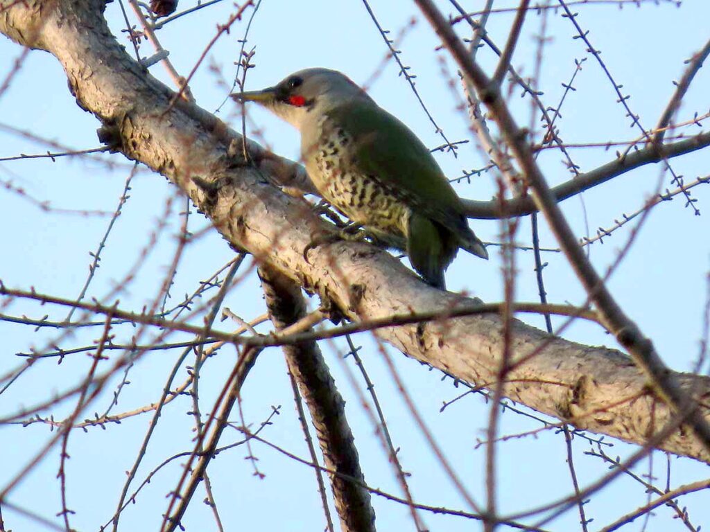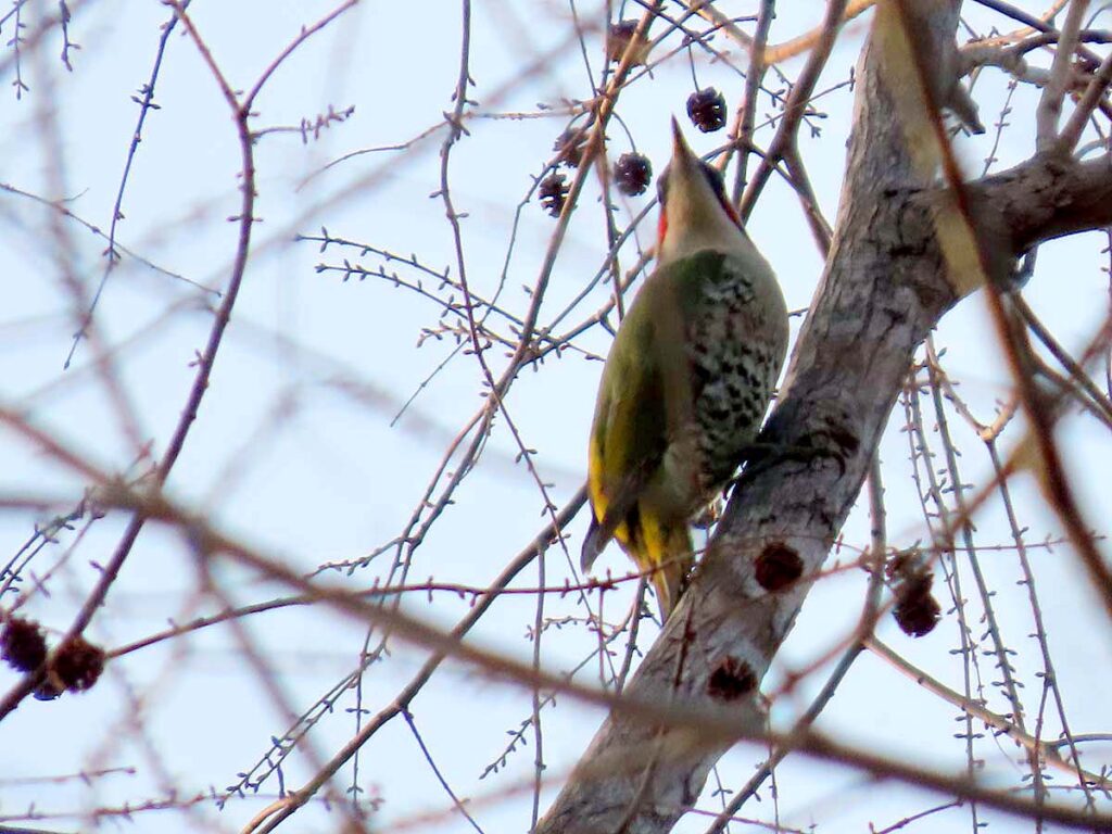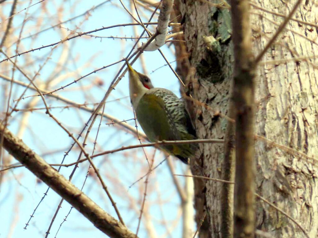 アオゲラ♀ 以前から聞いていたがやっと会えた。が、高いのと小枝が邪魔をして、ほんの証拠ばかり…。でも嬉しかった。