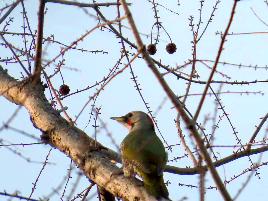 一昨日、久し振りに小鳥の森にルリビタキの♀タイプが居ると聞き、ヘルパーさんが終わってから覗いてみた。今冬初めからずっと居た子で、最近見かけなかったが、そろそろ帰る時分になってまた出て来たようだ。♀タイプだが、一層青色がかってきたようで、多分♂若なのだろう。一通り撮ってから、天気が良く、午後4時半とはいえまだ十分に明るいので、アオゲラ探しに弧ケ池へ寄ってみた。居ると聞いて何度も見に来てるのだが一度も見たことが無く、あまり期待せずにいたが、行くとすぐに「キョ、キョ」と声がした。見上げるとチラリ姿が見えた。慌ててたくさんシャッターを切ったが、まともに撮れたのは一枚もない。ま、今日は居たという証拠だけで十分だわ。