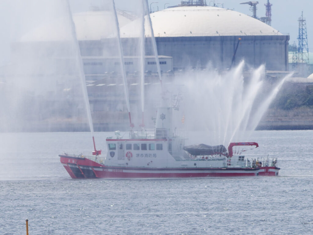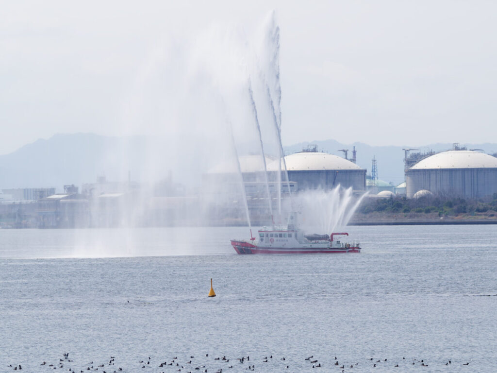 消防艇が一斉放水を始めた。虹が出てくれたらベストだっただろう