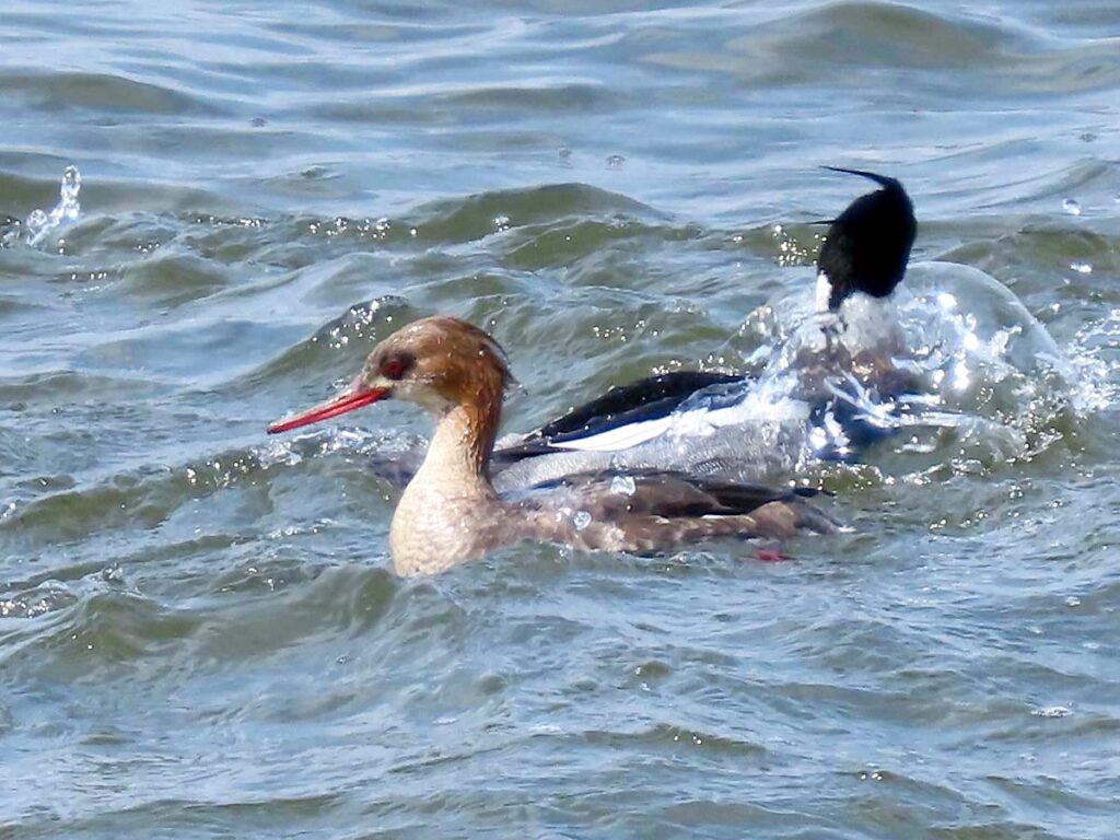 ウミアイサ♂♀の群れ6.7羽がやって来た。波にもまれて縦横無尽、忙しそうだった。