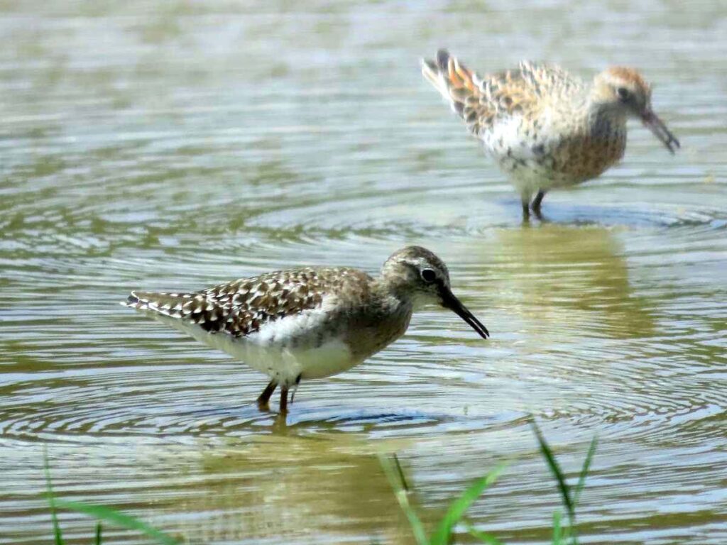 タカブシギ(前)&ウズラシギ(後) 肝心のウズラシギの方が、ボケてしまった。😢