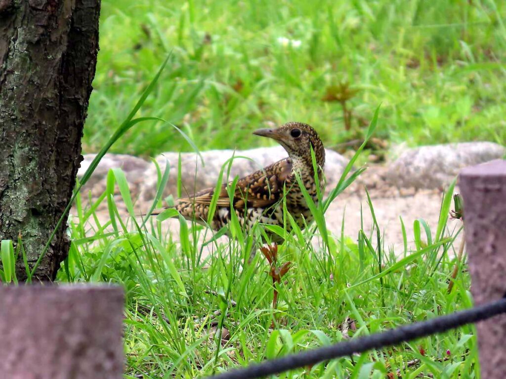 トラツグミ 梅林奥の木止まりから地面に降りて、芝生の中をウロウロしていた。