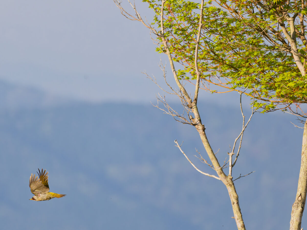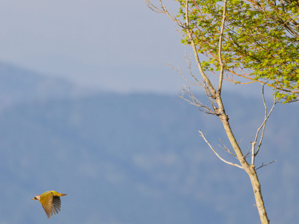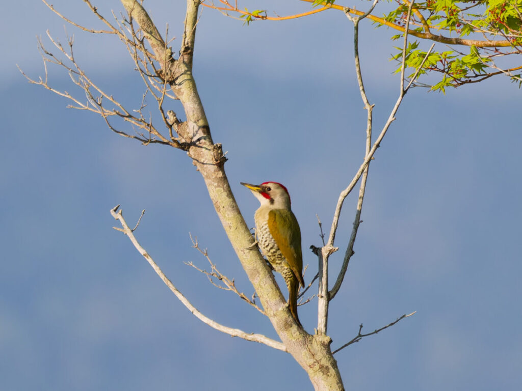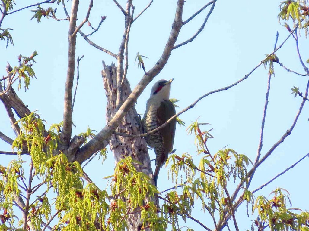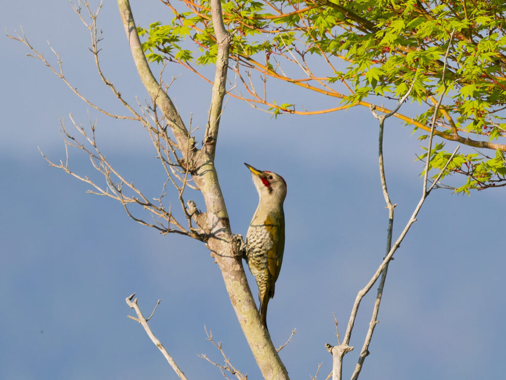 聞きなれない鳴き声がするので、あたりを散策すると開けた場所のもみじの木にアオゲラがとまった