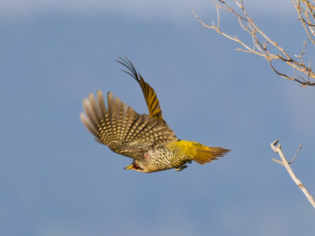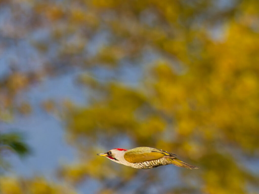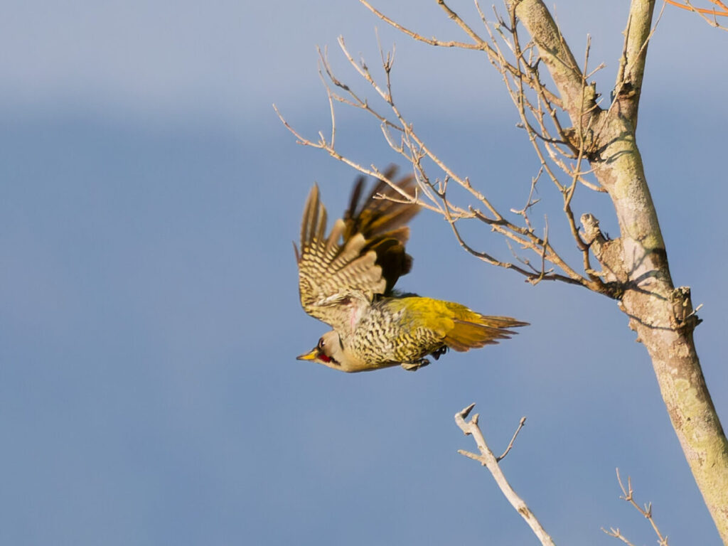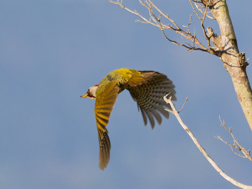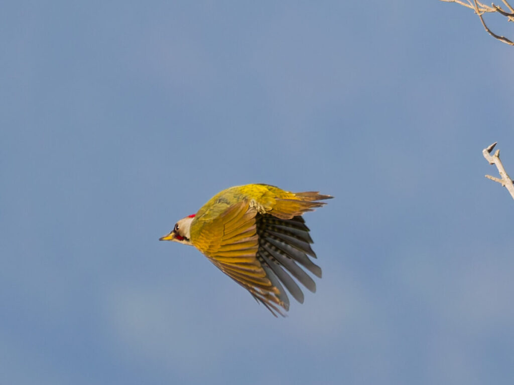 聞きなれない鳴き声がするので、あたりを散策すると開けた場所のもみじの木にアオゲラがとまった