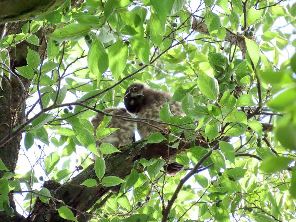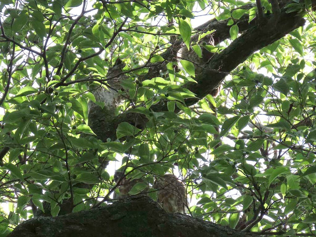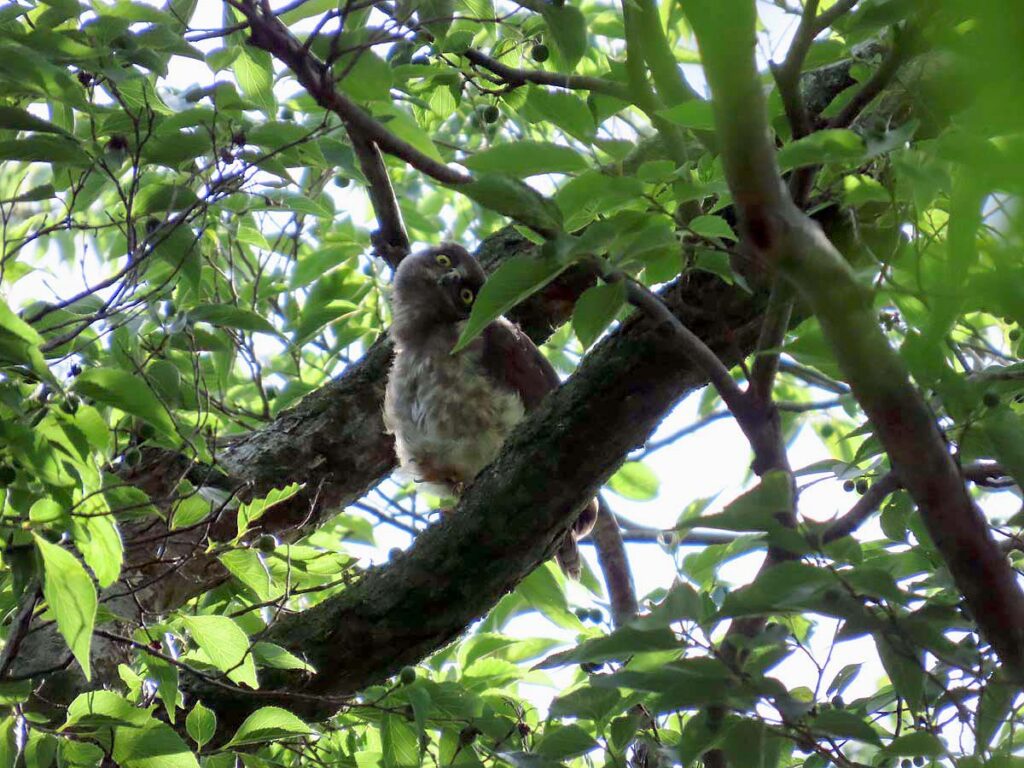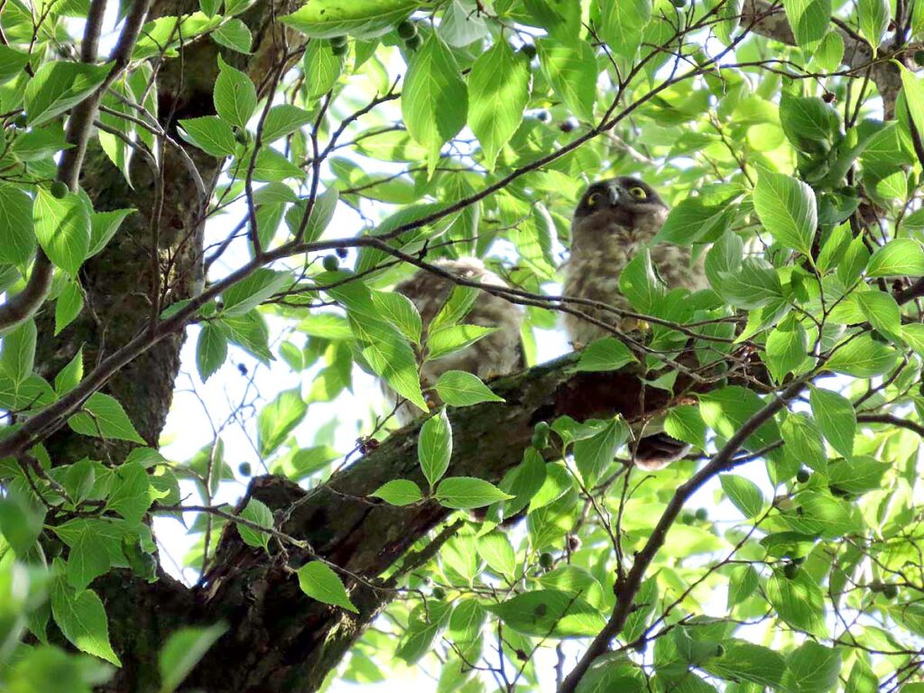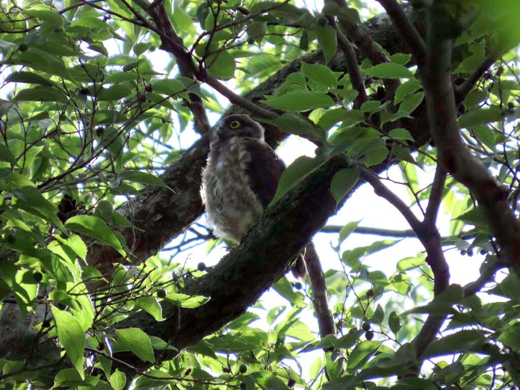 他に撮るものの無い時期のアオバズク、今回3度目となる。今日の雛は全部で4羽となり、多分これで全部の雛が巣立ちしたのだろう。3羽の雛がかたまり、別の所に1羽、その子の少し離れた所に両親が見守ってるという構図。同じ枝に親子6羽又は雛4羽がずらりと並ぶのはもう少し先の話だろうか。その時にもう一度来たいけど、さてうまくタイミングが合うかどうか…。