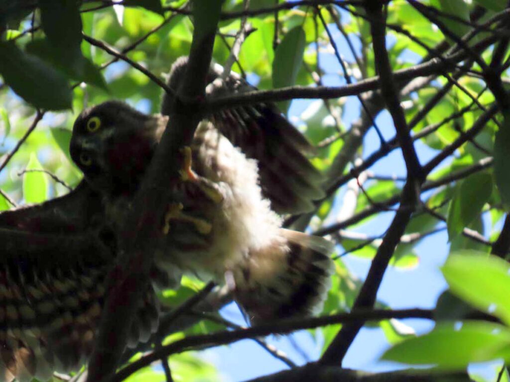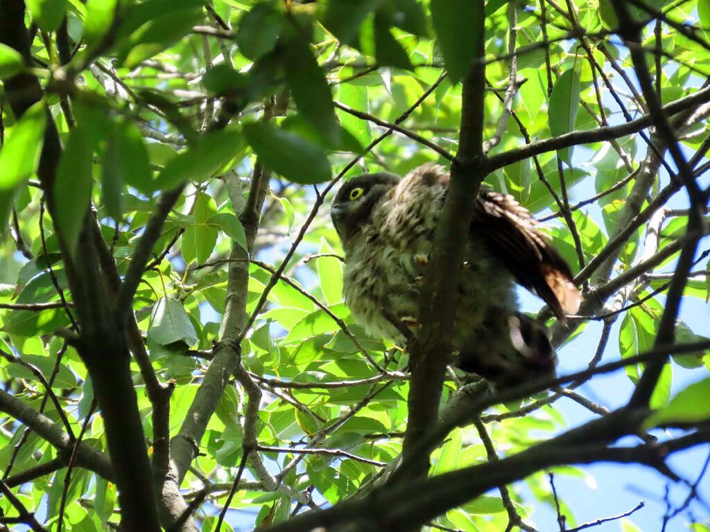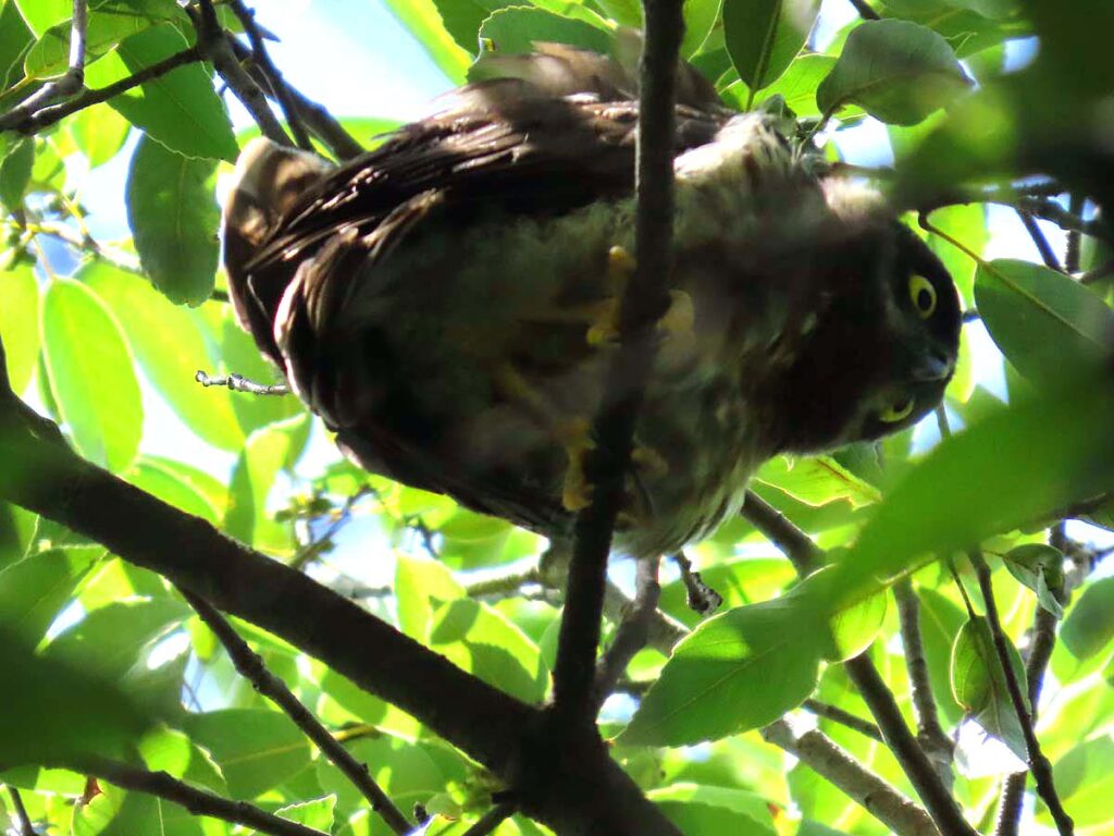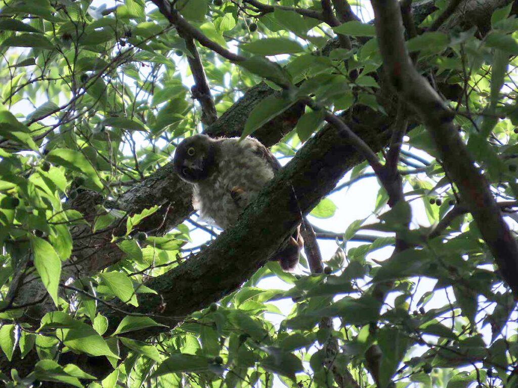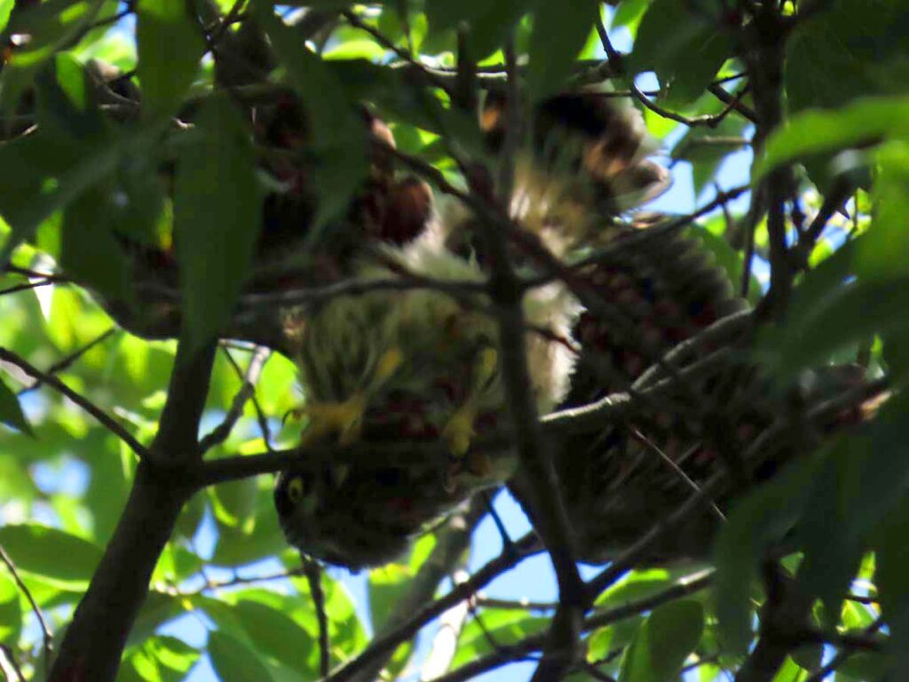 他に撮るものの無い時期のアオバズク、今回3度目となる。今日の雛は全部で4羽となり、多分これで全部の雛が巣立ちしたのだろう。3羽の雛がかたまり、別の所に1羽、その子の少し離れた所に両親が見守ってるという構図。同じ枝に親子6羽又は雛4羽がずらりと並ぶのはもう少し先の話だろうか。その時にもう一度来たいけど、さてうまくタイミングが合うかどうか…。