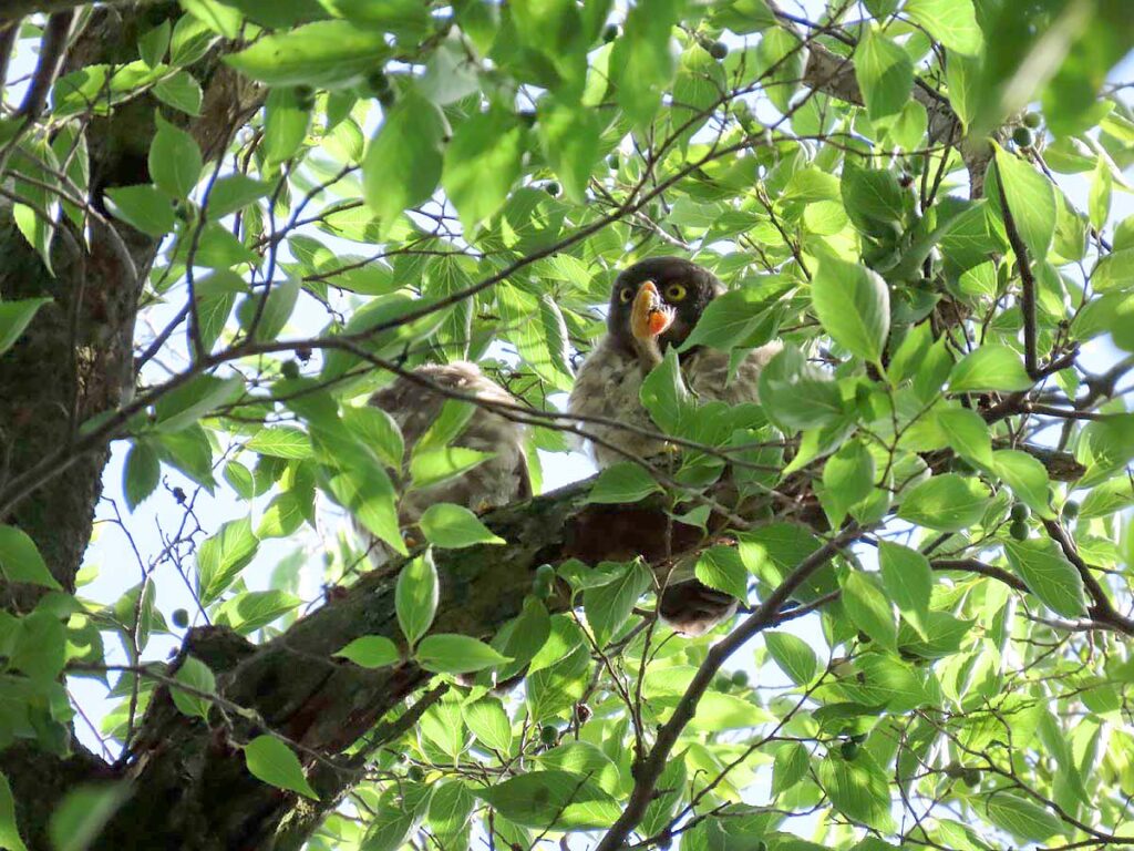 3羽の雛たち。判別しにくいが上の枝に1羽、下の枝に2羽。