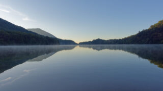 昨夜は疲れはてて、宿に着くなりもう出かけるのがつらく、湯に入り、バイキングの食事を満腹後、眠ってしまった。                               朝5時、約束通り支度して朝食前にホテル周辺を散策。すぐ傍の、湯ノ湖の水面...