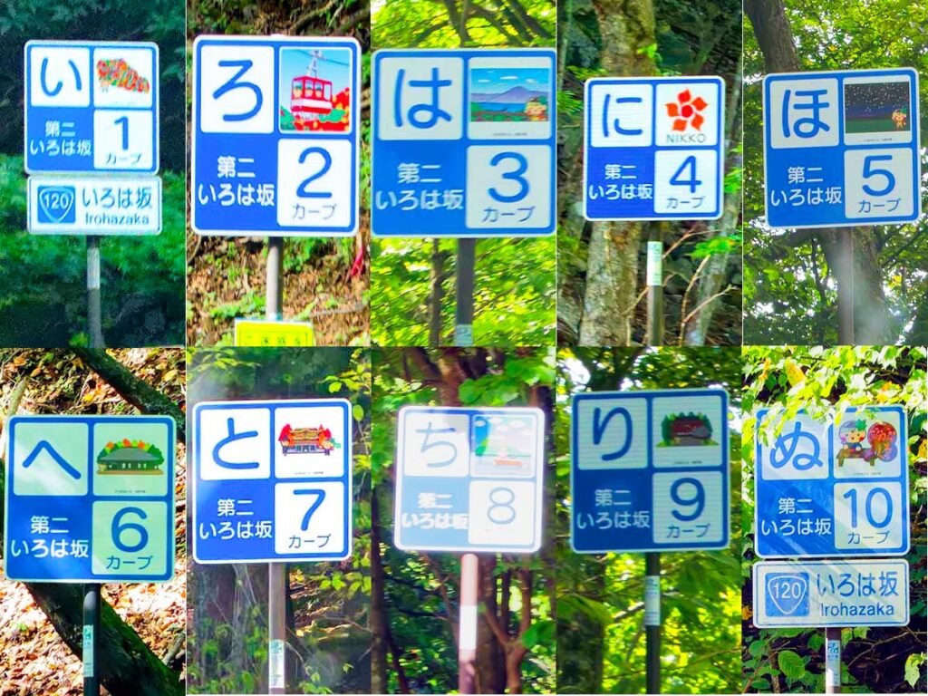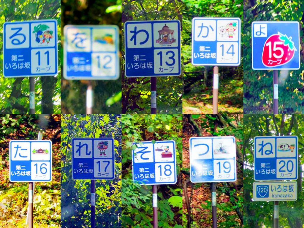 いろは坂 (色はにほへどちりぬるを 我が世たれそ常ならむ うゐの奥山けふ越えて 浅きゆめみしゑひもせす ん) 面白半分に、曲がるたびに「①い~⑳ね」 迄ある標識を撮ってみた。