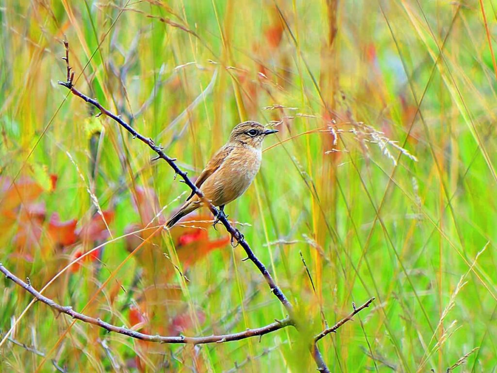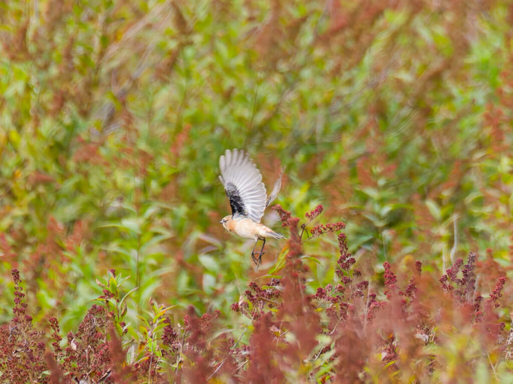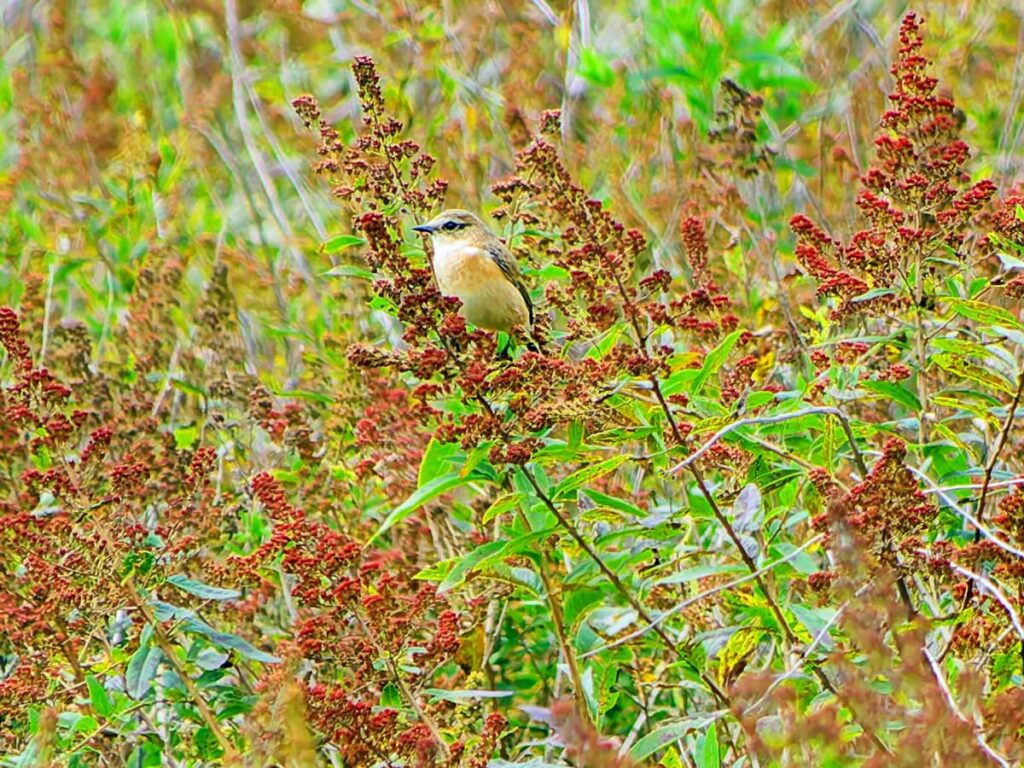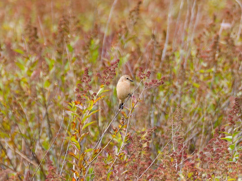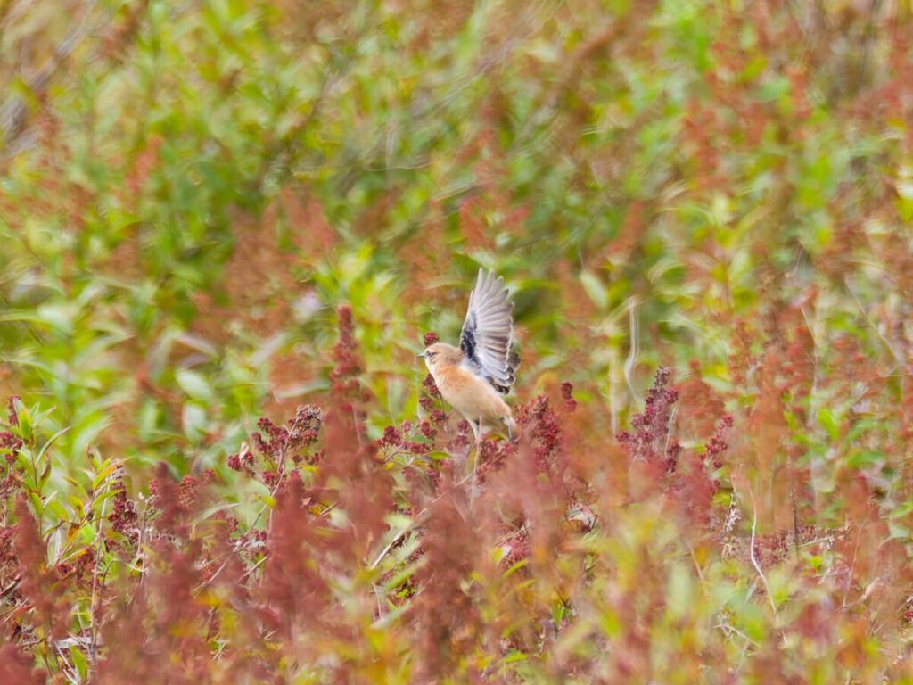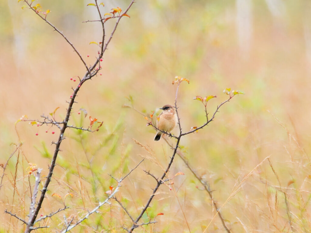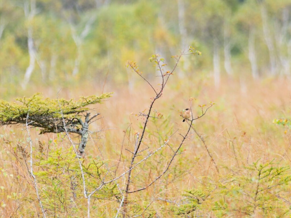 少し歩くと、小田代ヶ原側でも飛んでいた。ホザキシモツケの実とノビタキ♀。