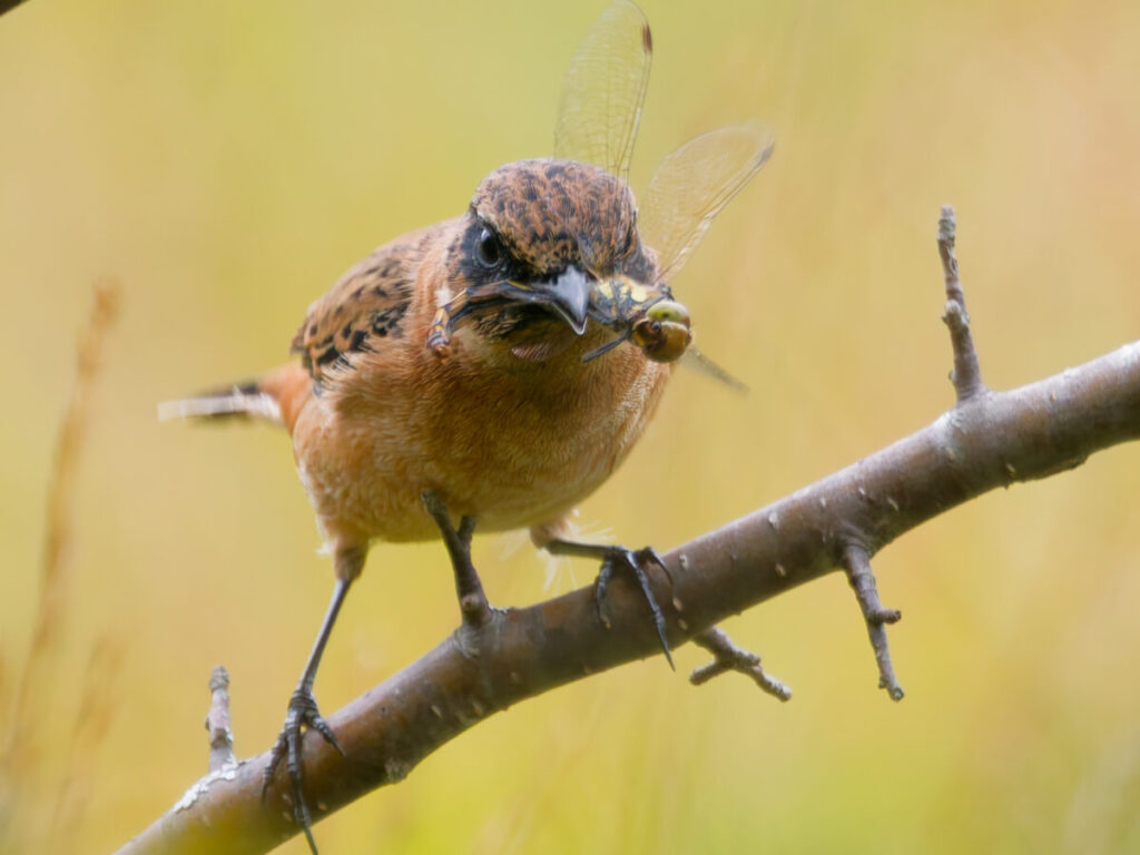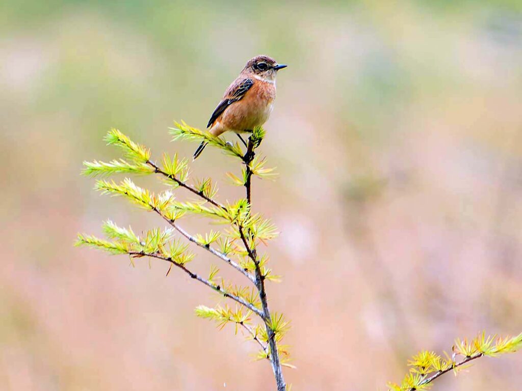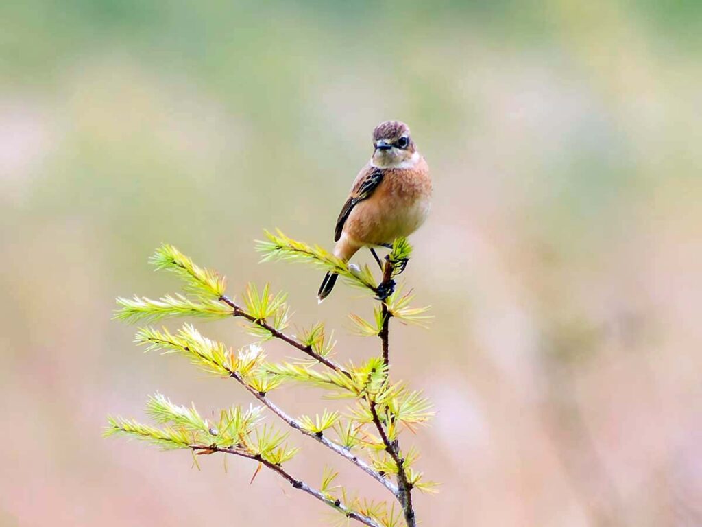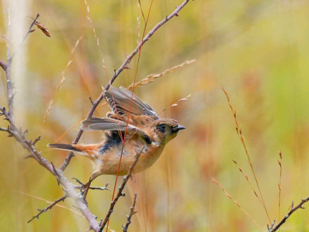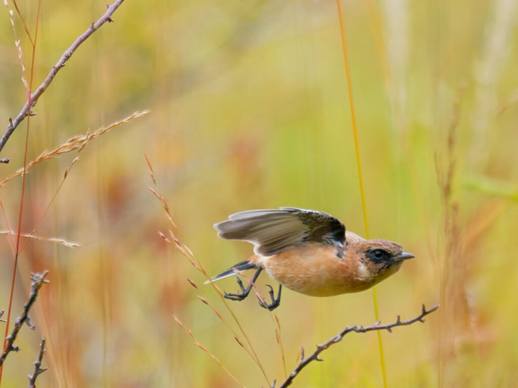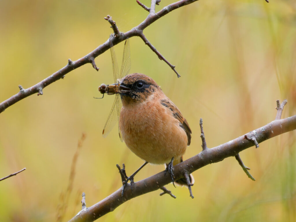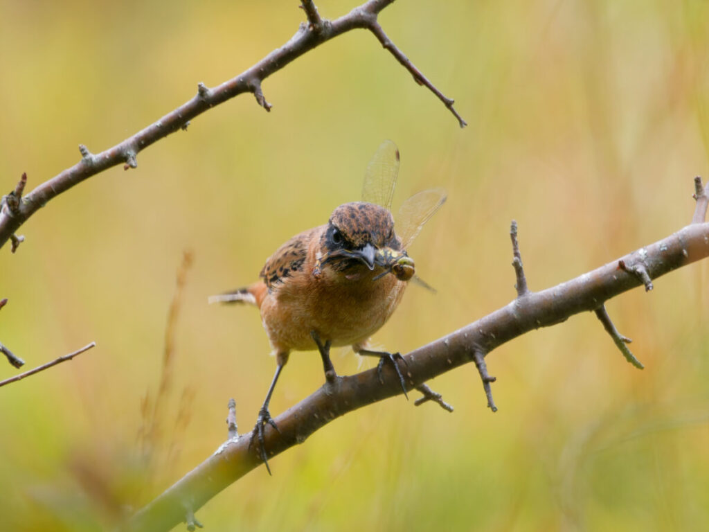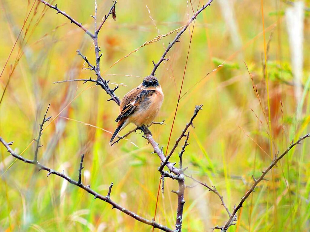 少し歩くと、小田代ヶ原側でも飛んでいた。ホザキシモツケの実とノビタキ♀。