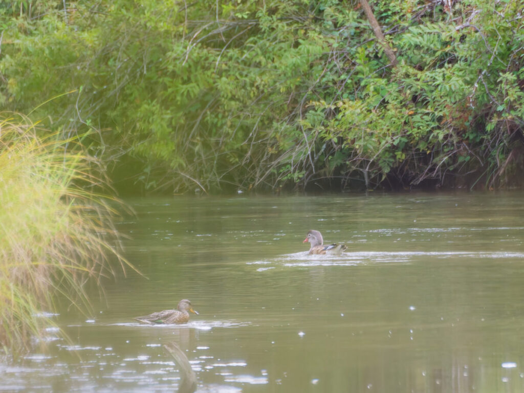泉門池の奥にマガモとオシドリ(右・換羽中?)