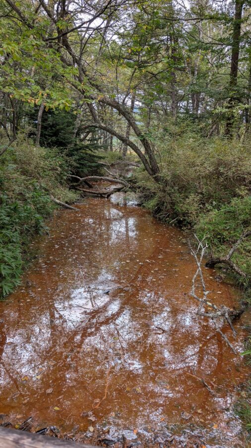 赤沼の由来になった真っ赤な川、錆びた鉄分とバクテリアによるものらしい。(スマホ)