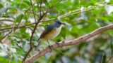 少し歩くと、小田代ヶ原側でも飛んでいた。ホザキシモツケの実とノビタキ♀。
