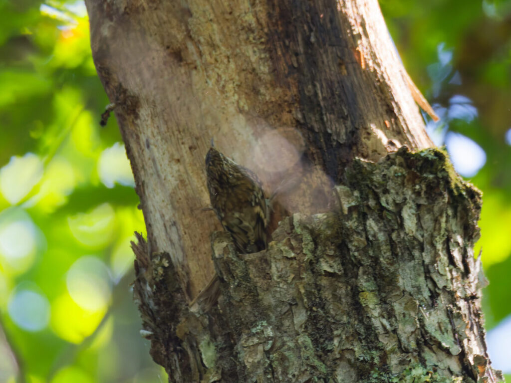 湯滝から泉門池のほうへ進んでいく。森の中で振り返ると木の幹を何か動いた。キバシリだ。