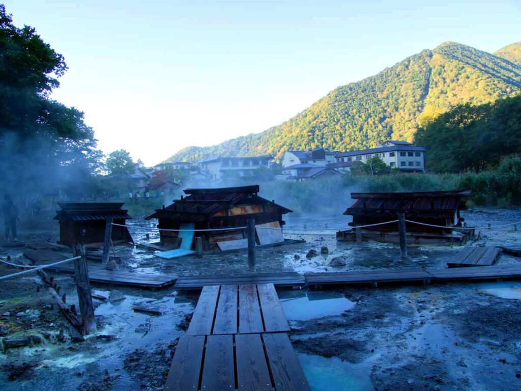 朝食後、昇り始めの朝日に、湯元源泉は硫黄の匂いと湯気に覆われている。