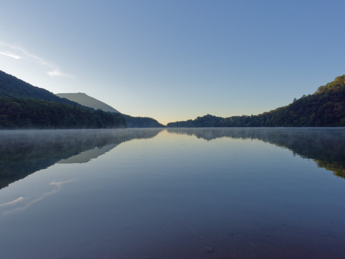 湯ノ湖 早朝6時、湖面には朝霧?が立ち込めて、幻想的…。