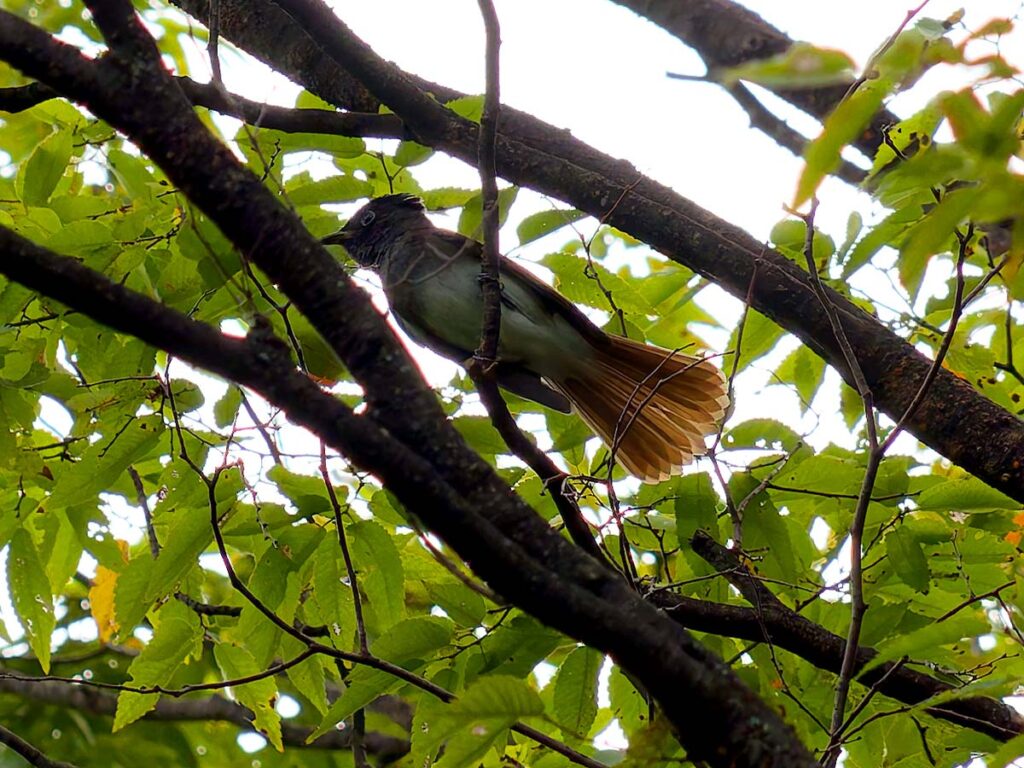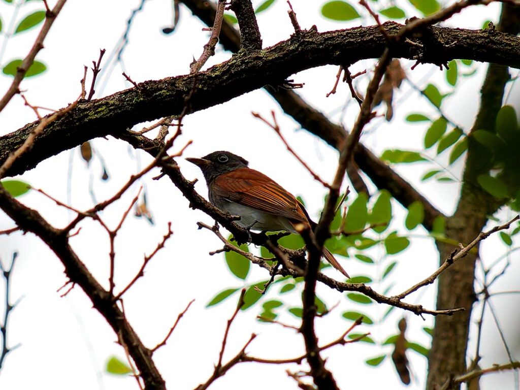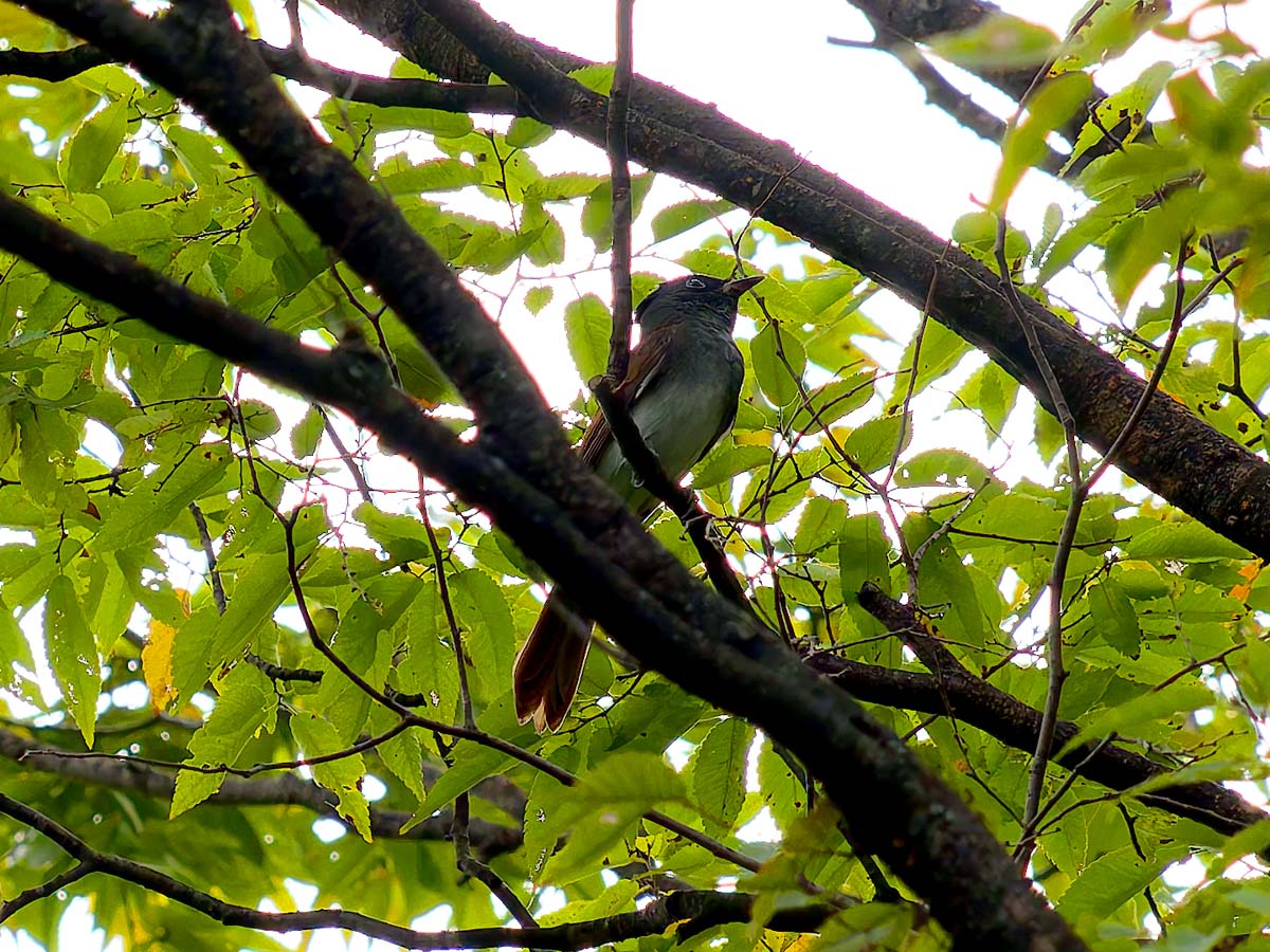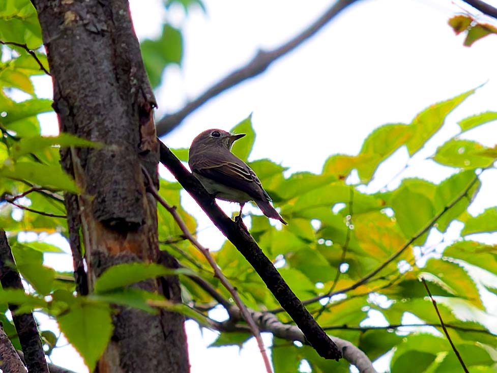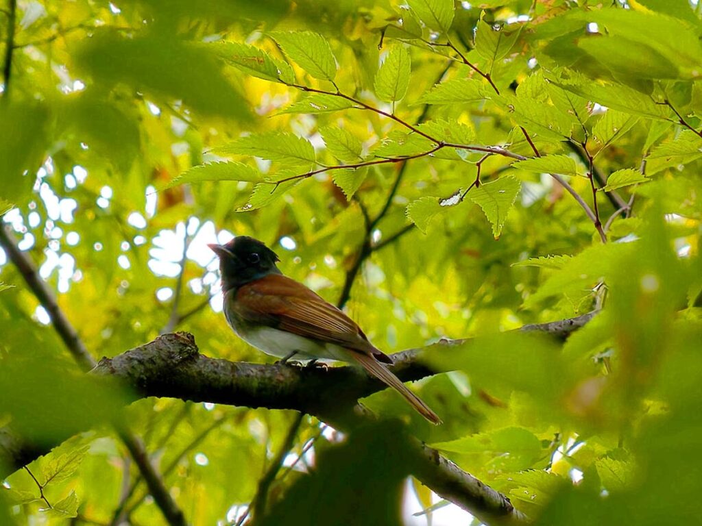 雨模様ながら今日も用事のついでに大阪城へ。市民の森から見て回ったが、鳥は勿論カメラマンも居ない。桜広場、豊国神社、梅林奥…。この調子では今日も坊主になるかもと思ったが、飛騨の森へ来てやっと人の気配。「つい今しがた、オオルリとキビタキの♂が出てたわ…」餌場の上の木を指さして、「昨日はこの樹にツツドリがおったんや」見知らぬ同世代の年寄りが教えてくれた。「ありがとう、せめてヤブサメでも待ちますわ」 ところが、それからの2時間出たのはコサメビタキだけ。「う~ん、これではほゞ坊主やわ…」今日は諦めようと、帰りかけたら、愛の森辺りで数人が上を見上げている。「えっ?」サンコウチョウ2羽が飛び回っている。時折分かりやすい所に止まるので、案外撮りやすい。30分余り、追いかけて、追いかけて、「わぁ、今日はサンコチョウで締めやわ!」
