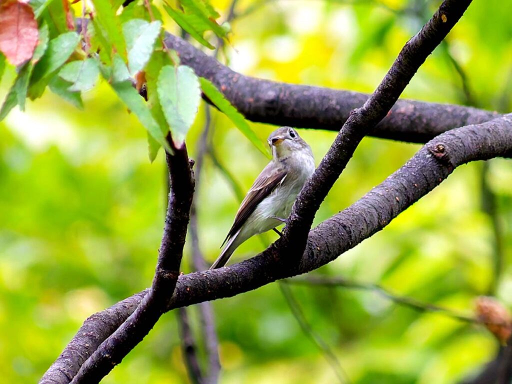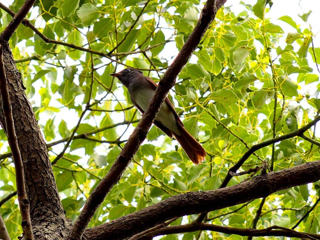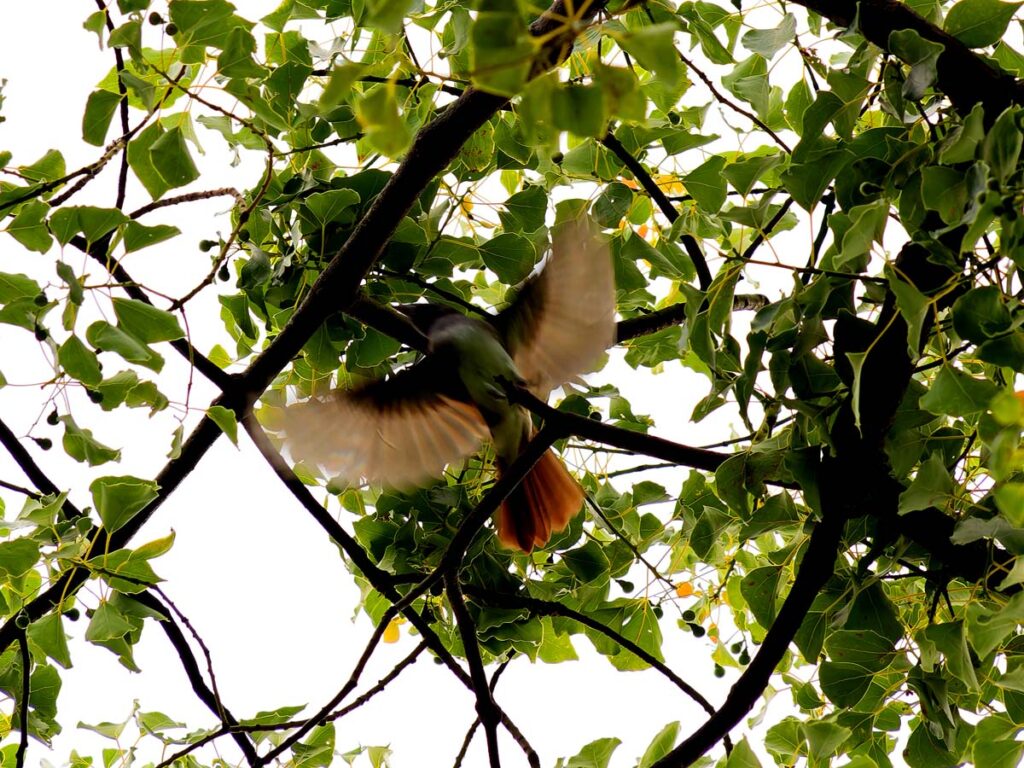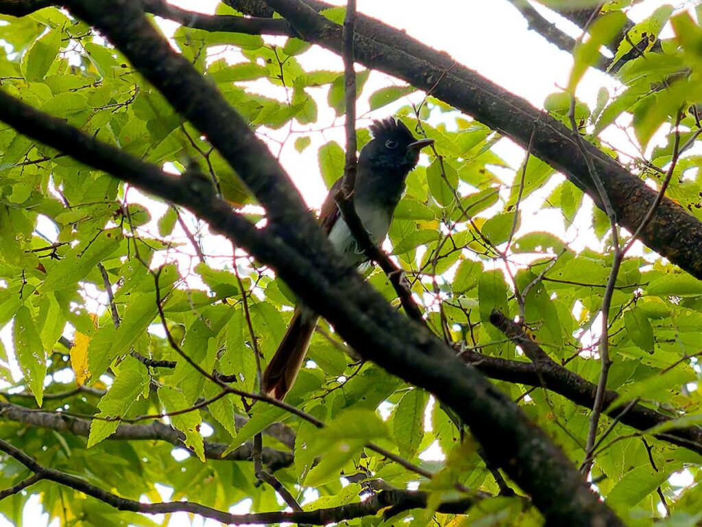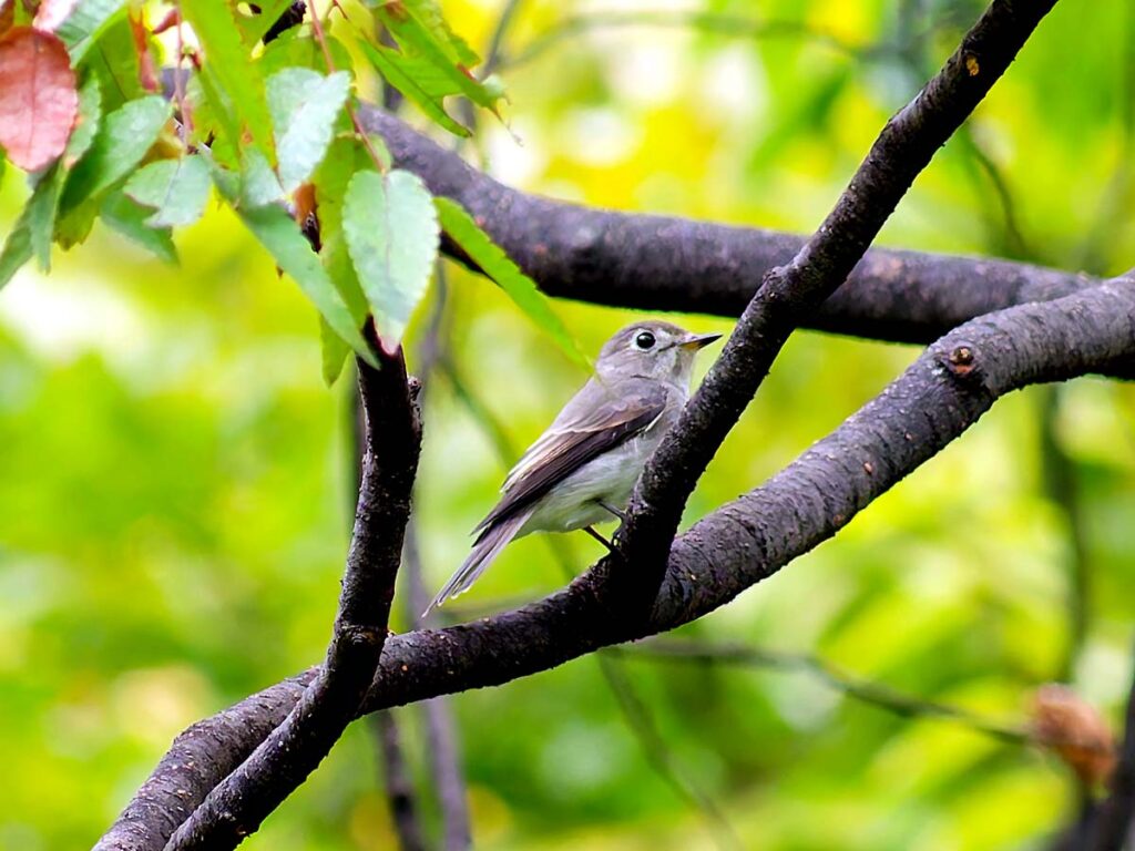 雨模様ながら今日も用事のついでに大阪城へ。市民の森から見て回ったが、鳥は勿論カメラマンも居ない。桜広場、豊国神社、梅林奥…。この調子では今日も坊主になるかもと思ったが、飛騨の森へ来てやっと人の気配。「つい今しがた、オオルリとキビタキの♂が出てたわ…」餌場の上の木を指さして、「昨日はこの樹にツツドリがおったんや」見知らぬ同世代の年寄りが教えてくれた。「ありがとう、せめてヤブサメでも待ちますわ」 ところが、それからの2時間出たのはコサメビタキだけ。「う~ん、これではほゞ坊主やわ…」今日は諦めようと、帰りかけたら、愛の森辺りで数人が上を見上げている。「えっ?」サンコウチョウ2羽が飛び回っている。時折分かりやすい所に止まるので、案外撮りやすい。30分余り、追いかけて、追いかけて、「わぁ、今日はサンコチョウで締めやわ!」