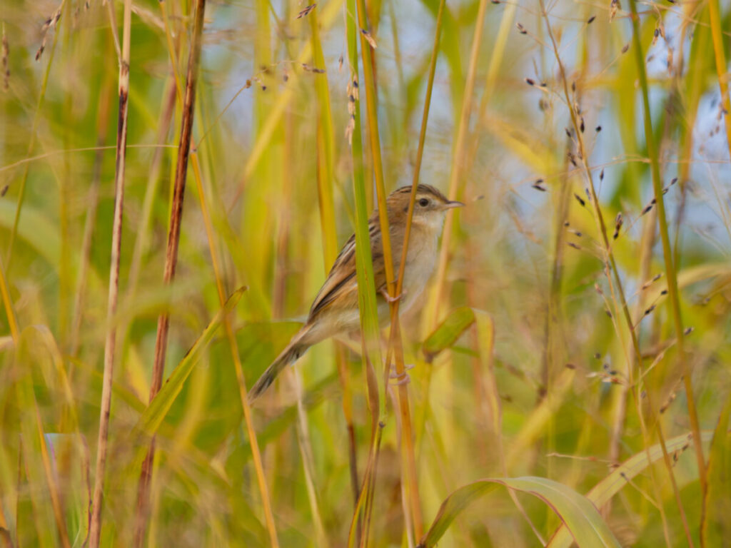 草の中からセッカが出てきたがピントが合わない。