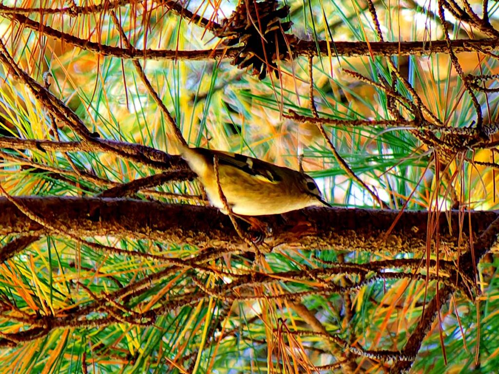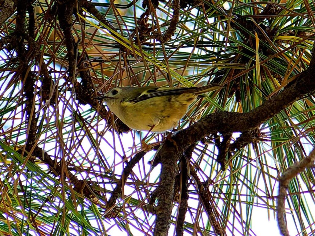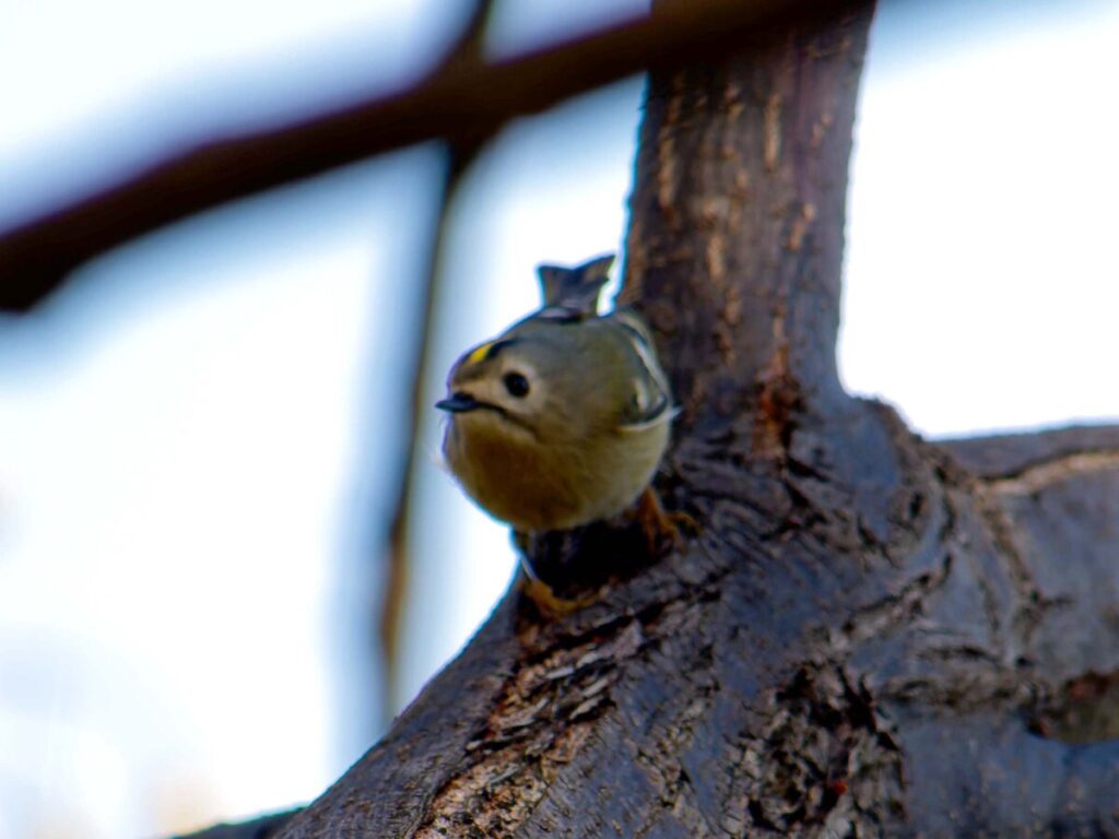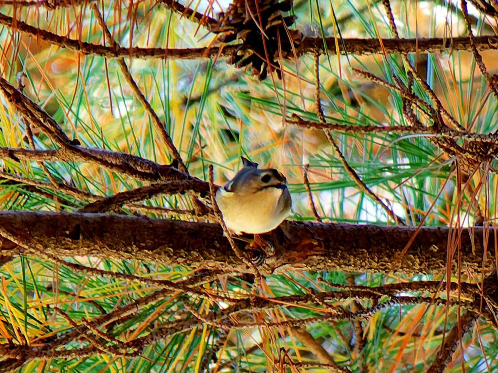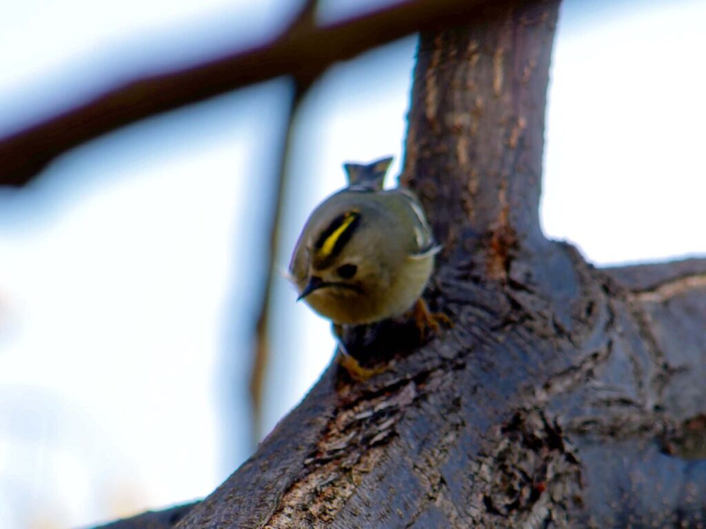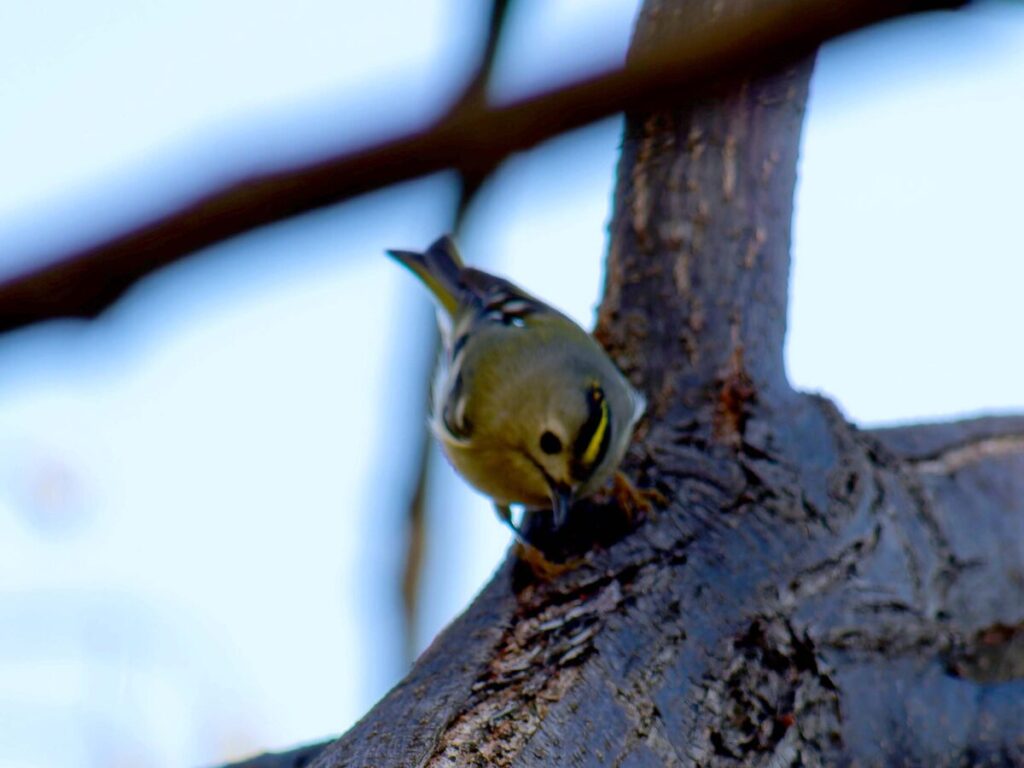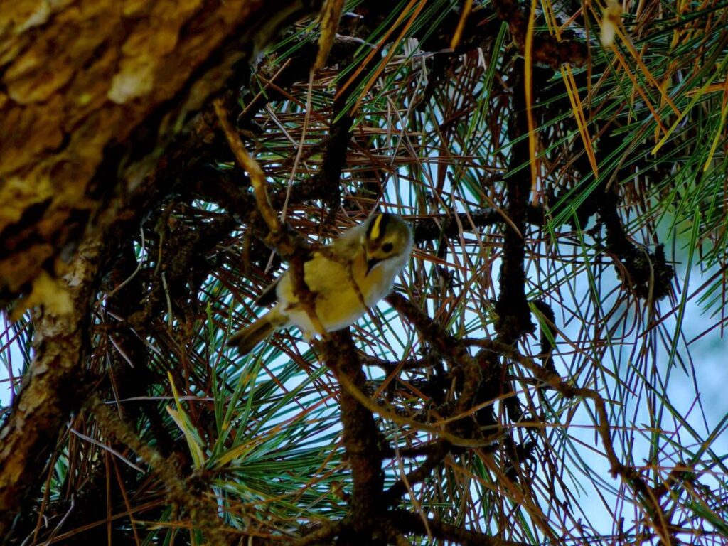少し遠いが頑張って自転車で行ったら、河原には延々と松の木が並んでいる。なるほどこれはキクイタダキにもってこいの所だ。ポイントにはカメラマンがチラホラ。「居るよ、さっきまで撮り放題だった」う~ん、遅かったかな…?ところがすぐに又カメラマンが動き出した。おぅ、居る!皆さんについてあっち・こっちと動くうちに要領が分かってきた。多分3.4羽位かな、だんだん目が慣れてきて、頭央の黄色いご紋がチラチラ…。最後に河岸の雑木の方へ移動、皆さん大喜び。松の木よりはるかにきれいに撮れるとか…、私はカメラの設定がうまく合わず、何とももったいない結果になってしまった。修正しきれない画像がいっぱい…。