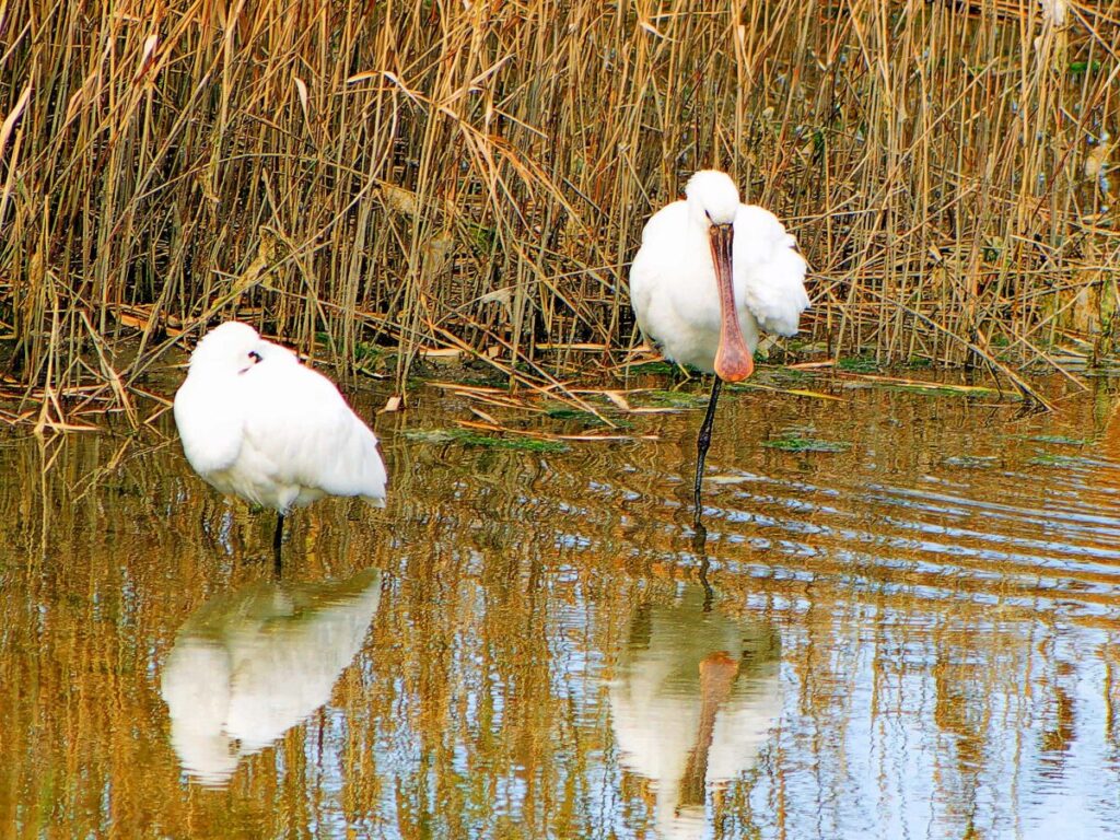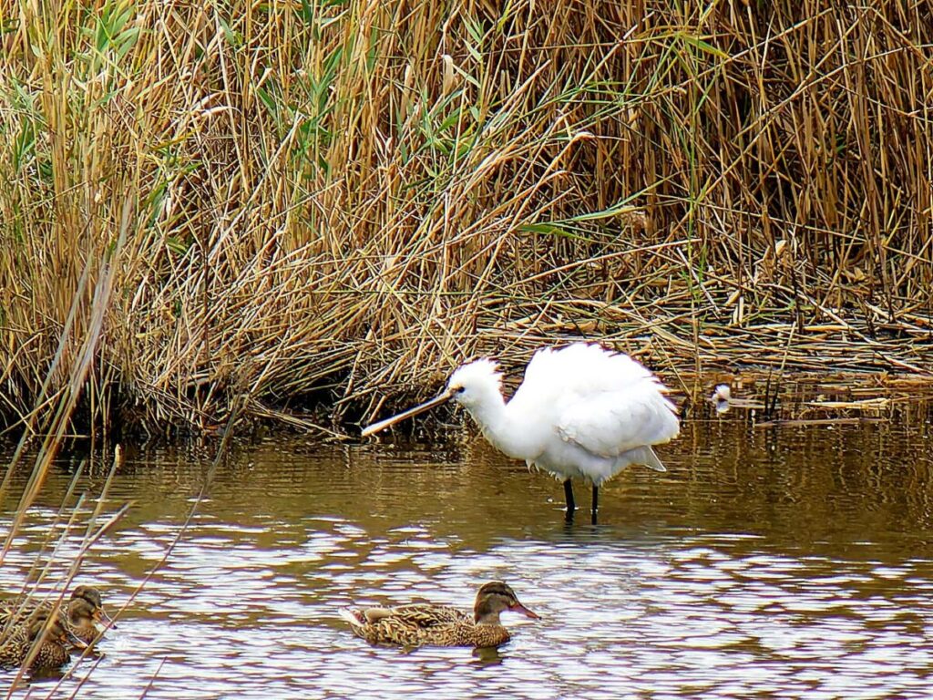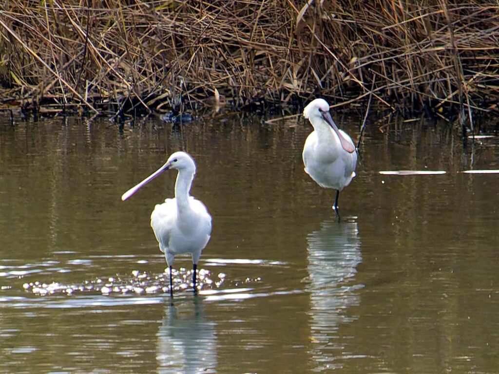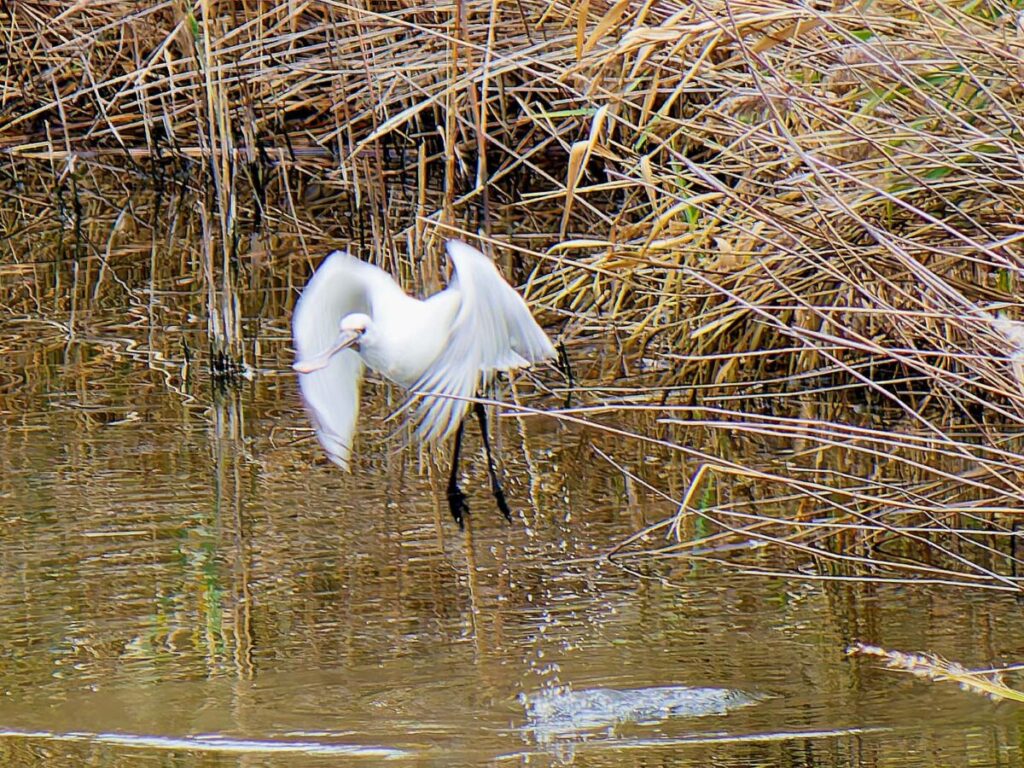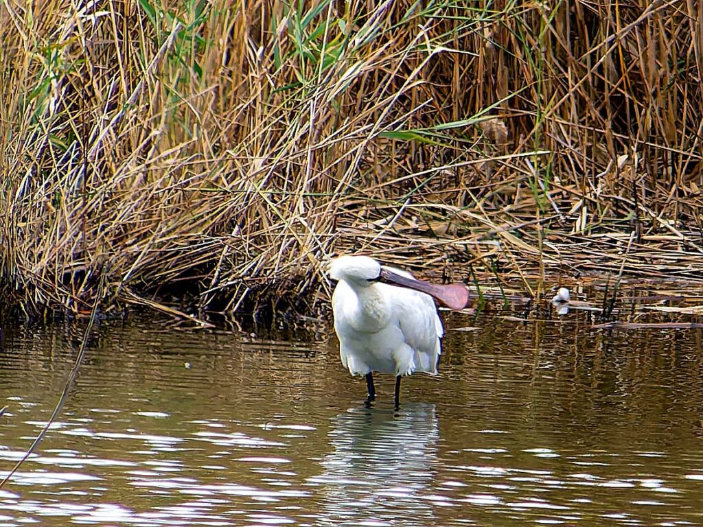 ヘラサギ 1羽は南池に居た。嘴が肉色なのは若いのかな?