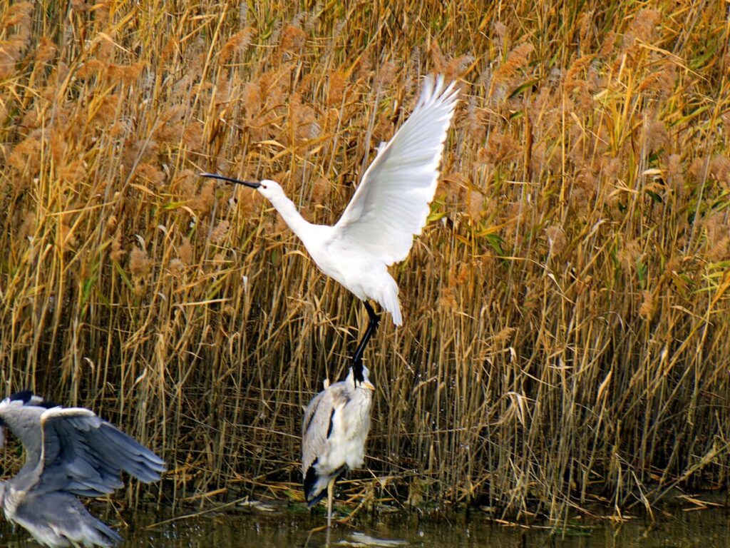 時々南港野鳥園の様子をチェックしているが、つい後回しになっていた…。潮加減も悪くないし、この時期らしく色々賑やかなので、思い切っていってみた。本命はヘラサギだが、ホオジロガモも居るらしくうれしい。着くと10人位のカメラマンで各窓はほゞ占領されている。先ずヘラサギを探すまでもなく、左側の池ですぐに見つかった。1羽か…、ところが反対側の窓の下に更に2羽が嘴をうずめて動かない。「よし」と今度はホオジロガモを探したが残念、今日は居ないらしい。ウミアイサの♀はたくさんいるが遠い所で厳しいし、どうも♂が見当たらない。そのうち南池のヘラサギがゴソゴソ動き出し、誰かが「飛ぶぞ!」取りあえず飛びを追いかけた。堤防の方へ向かい海へ行ってしまうか…、と思いきやUターン、元の場所に戻った。ふと見ると、遠くにツクシガモが1羽…、これは海の方へ飛び去った。ミサゴが飛んだり、窓下の木にジョウビタキ♀が居たり、2時を過ぎた頃、北側のヘラサギ1羽が嘴を出した。おう、この子は嘴が黒い!成鳥のようだ。あ、飛びそう!成鳥の方が先に飛び、追いかけている内に若い方も飛んだようで、途中で追いかけている鳥が若い方に変わっていた。2羽は最初の南池の若い子と一緒になり、成鳥は池の奥に消え、見える所には若い2羽が身を寄せて抱き合うように見えた。帰り道で、頭上にタカ!ノスリだ。真上で青空に舞う姿は美しい! 帰って画像を見ると、真上過ぎて顔が見えていない…。