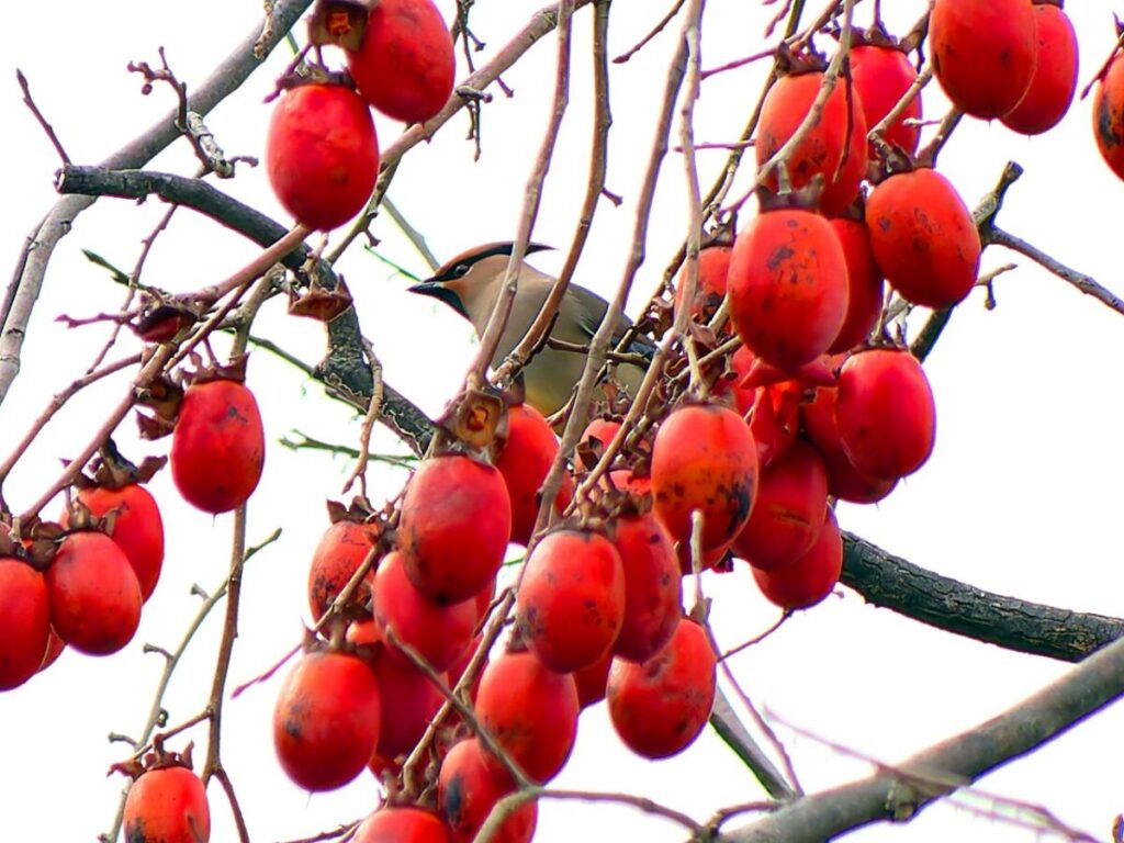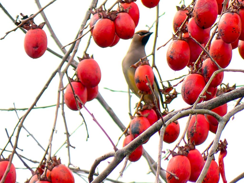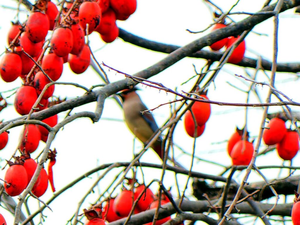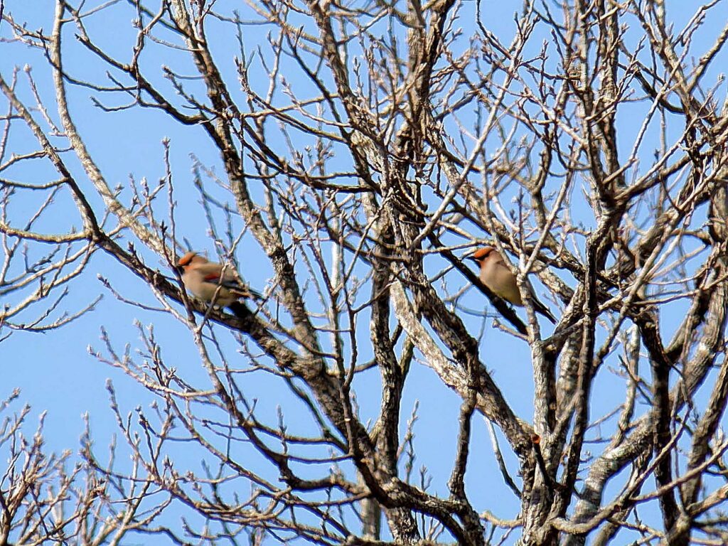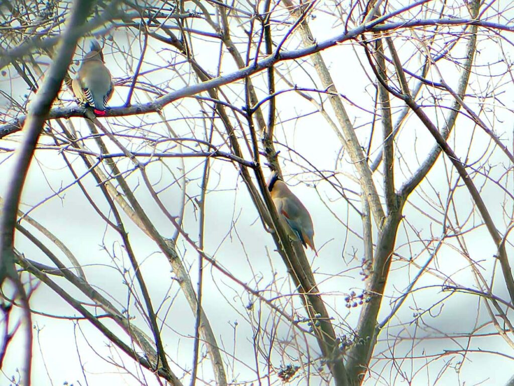 ヒレンジャク数羽 柿の実より遠く離れた樹に6.7羽が待機しているが、多くのカメラマンのせいか、柿の木にやって来ない。撮るには遠すぎて話にならない…。