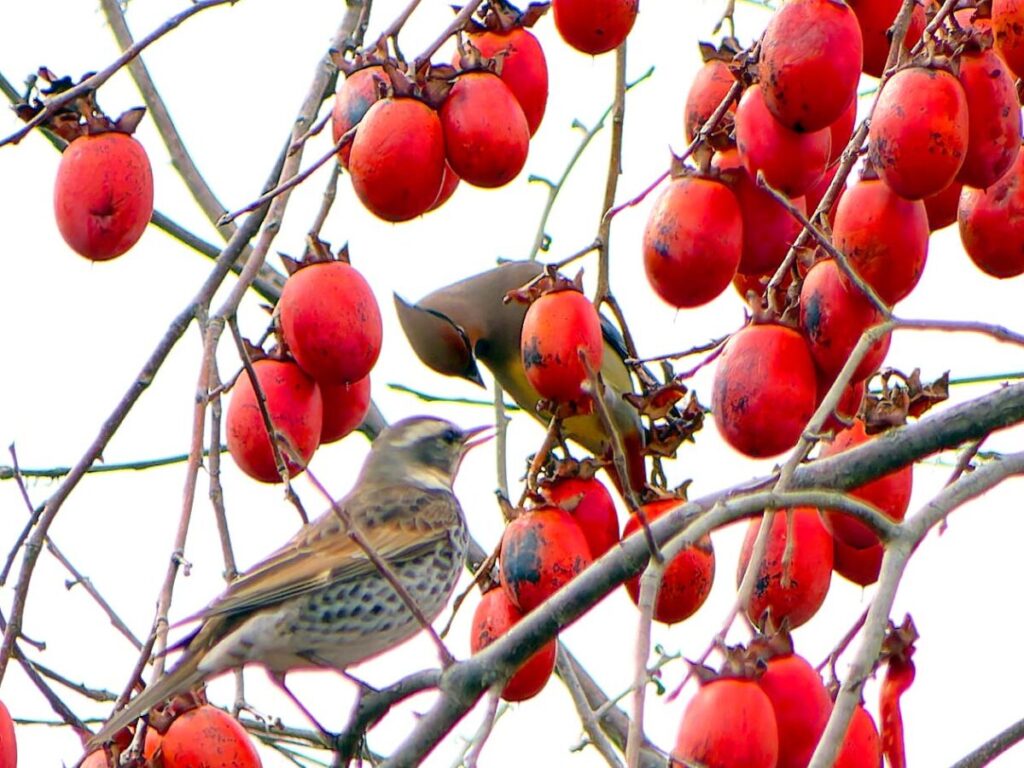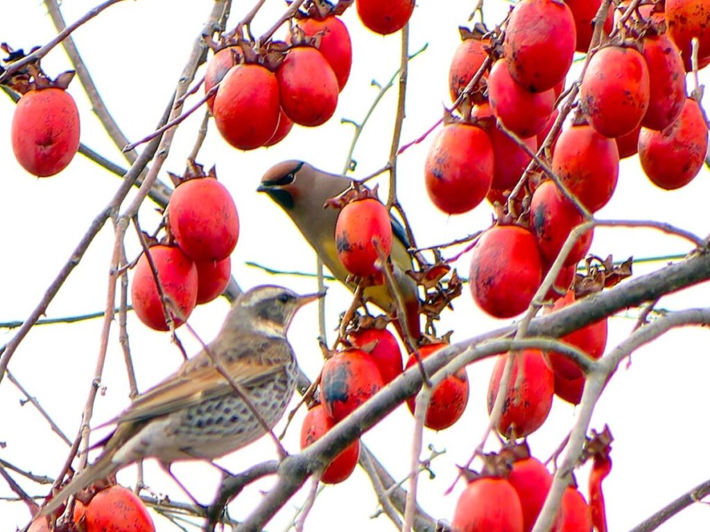 一度、一羽だけが柿の実にやって来たが、周りはツグミだらけで、かろうじて全身が写ったのがこれ1枚…、でもピントが大きく外れていた…😿