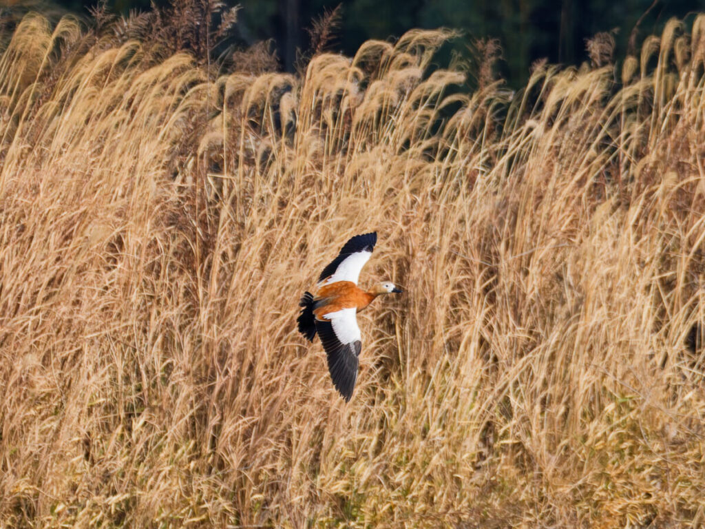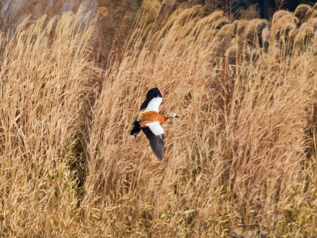 アカツクシガモ、いっせいに情報が出回ったのか、虎さんに連れて行ってもらったら、現地にはズラリと車の列。珍鳥のアカツクシガモの人気は半端ない。着いた時は丁度近くの池に飛んだ後、歩いても近いと言われて黙々と歩き、やっと着いたと思ったら又、「飛んで元の池に戻ったよ」ムッ、バカにしないでよう…、再び歩いて元の場所へ。やっと赤いかわいいアカツクシガモに会えた、が、超遠い。10年くらい前に奈良や、出雲で撮ってはいるけれど、ずっと近かった。その時もメスだった。今回は広い池の中洲の一番奥で、しばらく証拠写真を撮るうちに、今度は同じ池の左奥へ飛んで見えなくなった。少しは飛び物が撮れたかな?「すぐ戻るよね」雑談しながら待つこと30分弱、「アレ?」あっという間に目の前をかすめて通り過ぎ、Uターンして元の中洲に戻った。えぇ? 結局再び中洲の一番遠い所に落ち着いてしまった。