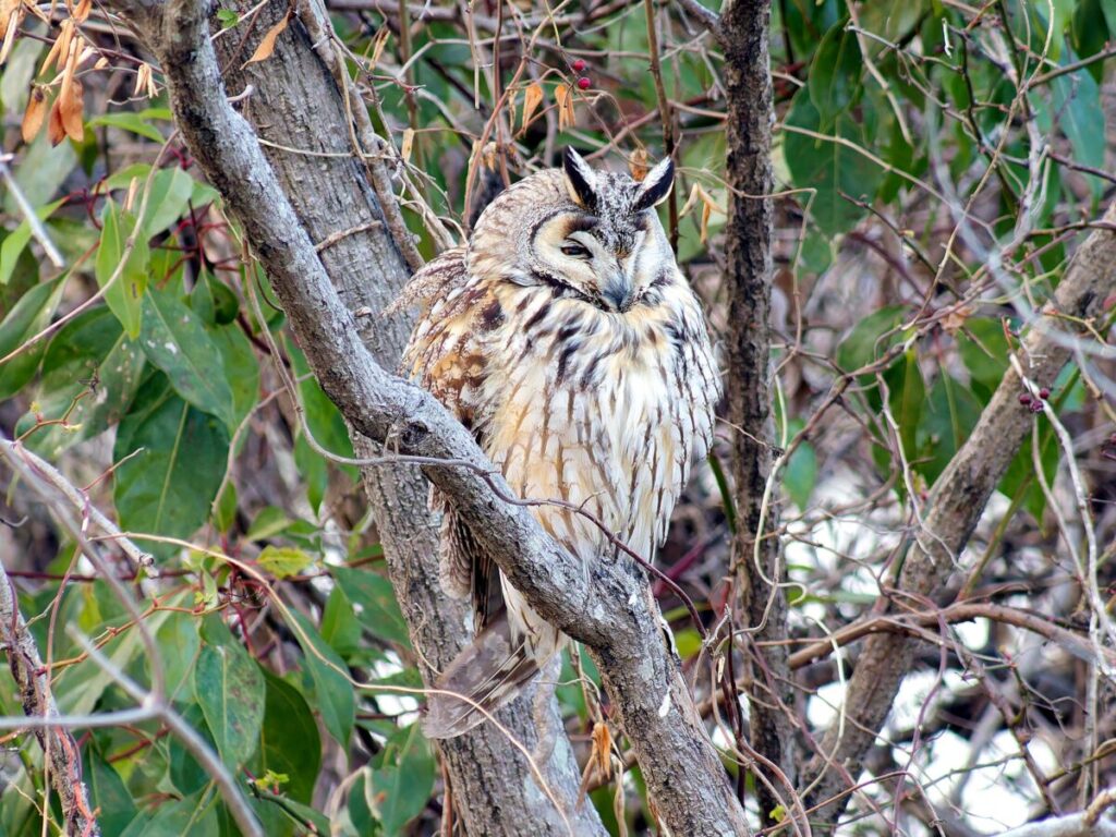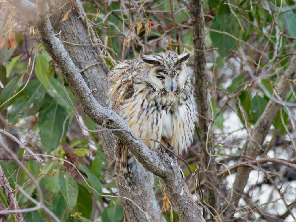 アカツクシガモの後はトラフズクの場所へ移動。暮れに行った時は2羽居たのだが1羽になっていた。ほゞ以前通りの場所に居て、今回も時々薄目を開けるだけで、ほとんど赤い目を丸く見開らくことはなかった。
