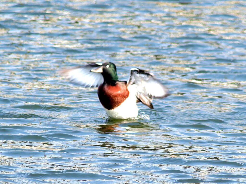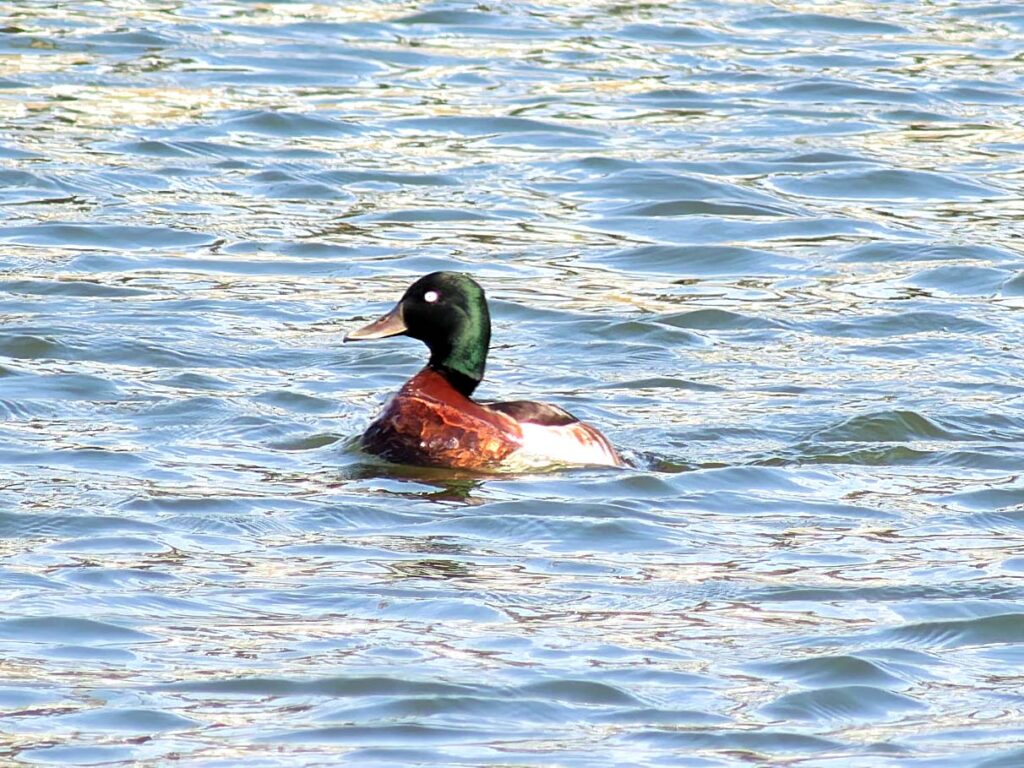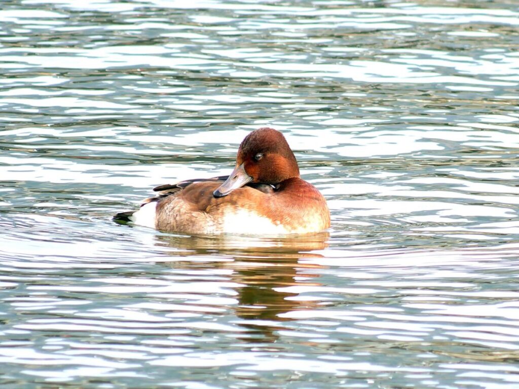 さて駅に着くと、ポイントはおおざっぱに聞いたでけで、地図には池の名前が挙がらないと言うことで、色々説明に合う池に目星をつけたものの不安いっぱい。駅で聞こうにも駅員のいないローカル駅で、歩き出しても土地の人に出会わない。目星の池はすぐにみつかったが誰も居ず、カモはたくさん居るのだが、いくら探しても本命2種は居ない。こうなるのは覚悟の上なので、次の帰りの電車の時刻までカモたちを見ていようと決めた。20分位してやっと地元の方に会い、「2.3日前まで沢山のカメラマンが居た」と言われた。「やっぱり、この池でよかったんだ!」やっと安堵したけれど、「目当てのカモはなぜ居ないんだろう?抜けたのかもしれない…」しかし念のため電車の時間を遅らせてもう少し待つことにした。それから間もなく、突然カモの群れが飛んで来て、その中にアカハジロとメジロガモも居て池に並んだ。オゥー!やっぱり居たんだ!数分間2羽で泳いでいたが、メジロガモは他のカモたちの中に入り顔を埋めてお休みモード。アカハジロは池の一番遠くに1羽だけ離れてウロウロと泳ぎ続けているが遠い!近づくと更に遠くへと離れるので結局近くで撮ることは出来ず、カメラマンが自分一人というのはどうにも不都合だ。メジロガモはずっとお休みモード。結局初めに入って来た時の画像だけが収穫だったが、次の電車の時刻となり池を離れた。