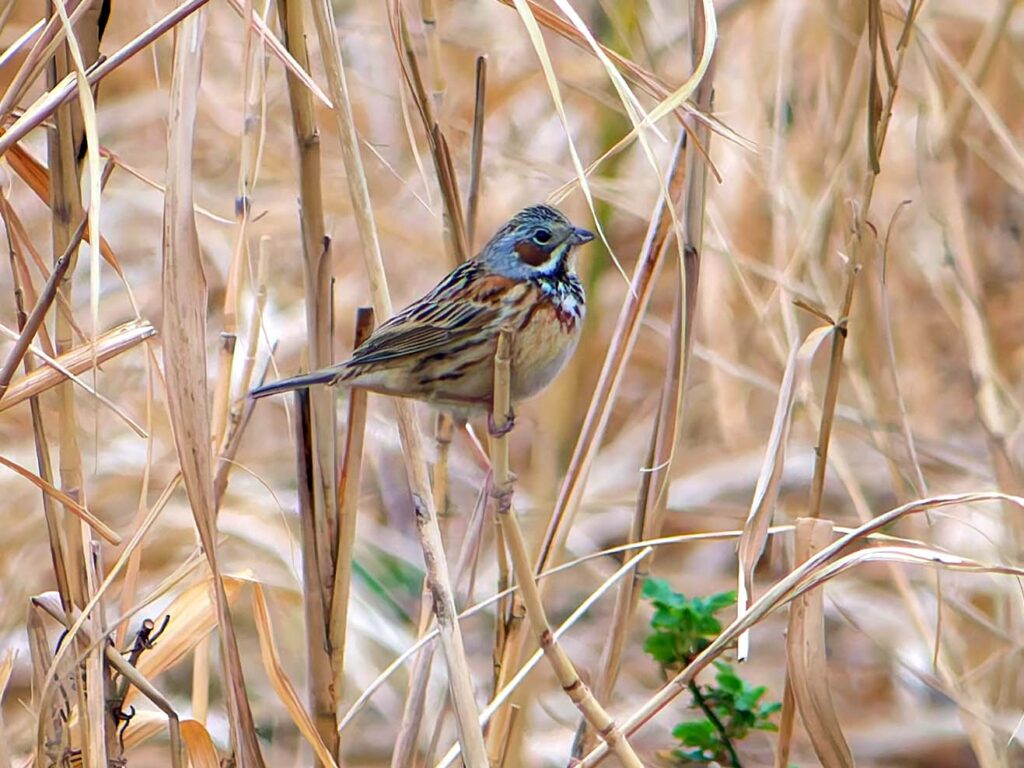 現地到着は11時前。先客は一人、ミサゴを撮っておられた。ホオアカは?と聞くと昨日ここで撮れたそうだ。良かった…やっぱり出ているんだ。しばらく回りを見渡していると、ほどなくパラパラと動きがあり、1羽が傍の枝に止まった。ホオアカだ!2分位止まっていたがフッと下の草に潜った。わぁ、撮れた!その後二人ずれが来たり、ばらばらと見に来る人が居たが本命は出ず、次に出たのはなんと2時間半後の午後2時前。足元の木が動きホオアカが地面に降りた。しばらくウロウロしている。朝の皆さんは諦めて帰った後で一人占め、たっぷり撮れた頃に、一人が来られたが間に合わず。が、それからも何度か出てくれた。満足して、ついでに昨日に引き続き川の中のヘラサギ1羽を又撮って帰った。