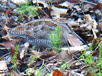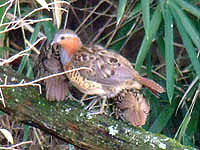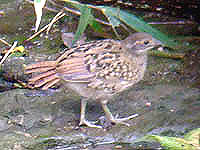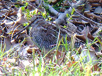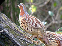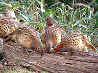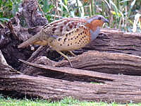 ![]() コジュケイの幼鳥 一列に並んだファミリー4羽(倒木の下に1羽と全部で5羽居た) |