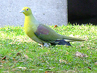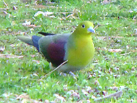 アオバトがバーベキュー広場へ降りるのは大体お昼前後らしいので、今日はそれだけに絞って緑地へ行った。数人のカメラマンが居て、今日は朝から一度も降りてないという。じゃ、これからだ!しかしどうもアオバトとは相性が良くない私、1時間も待つといらいらしてくる。要はせっかちなのだ。2時には本気で帰ろうとしたが、「後30分・・・」と我慢。この我慢がアオバトに通じたのか、パラパラと降り立った。ものの数分間、飛び去る時も速い。我に返ったカメラマンたちは一様に「ホゥ!」と息を入れた。 | |