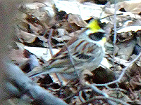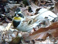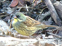 翌早朝、アオバトが水飲みに降りるという小鳥の森で待ったが、警戒されて不発。バーベキュー広場へ移動しかけて、ミヤマホオジロを見つけた。が、すぐに見失なった・・・。それっきり分からない。バーベキュー広場ではアオバトが1羽降りたが、カメラのバッテリーを抜いたまま。慌てて予備を入れて撮り初めたら、すぐに飛び立った。なんと間の悪い・・・。意気消沈、そのまま帰った。 そして夕方、再びミヤマホオジロねらい。ハズレを予想してオカリナ練習を兼ねて待つ。5時過ぎ、公園のチャイムが鳴り終えると、横の広場では、幼い子と若い父親のボール遊びの音だけになった。2月後半、陽が長くなってまだ十分明るい。・・・小鳥の森に気配!やっとミヤマホオジロが出てきた!アオジ5・6羽と一緒に無心に採餌。時折レンズに気づいて首を上げるが気にしない様子。あぁ、もう少し明かるければ・・・。私の撮り方ではボケボケ、証拠のみ。それでも私は十分気を良くして引き上げた。 |