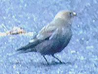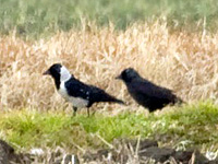 沖縄にいたというハイイロガン。トラフズクで賑わった平城宮の側・水上池で発見されたが、数時間で北上。偶然琵琶湖の水鳥センター前に居るのが確認された。多分同一固体と思われる。ここもすぐに移動、翌日には湖北で、コハクチョウやサカツラガンと一緒にいた。この機会を逃したら再び見ることは無いというので、何はさておき湖北へ参上。すでに数台の車が連なり一目瞭然。かなり近くに居た。1羽のマガンにぴたりと寄り添って採餌。時折サカツラガンとのツーショットも。嘴と脚がなんとも言えずきれいなピンク色。ただ予報に反して雨風がきつい。幸い現地で出合った鳥仲間の車に便乗でき、ついでに大中干拓でコクマルガラスをチェック。淡色型を3羽確認した。また西の湖ではハイイロチュウヒを見、更にコミミズクもと欲張ったが、これはさすがに見れなかった。風雨はますますひどくなり、車から出られない状態。便乗できて良かった・・・。 (←写真は知人が撮ったコクマルガラス) |